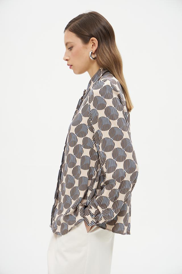 Особенностью модели является оригинальный геометрический принт, сочетающий в себе оттенки бежевого, кремового и тёмно-синего. Воротник-стойка с завязками добавляет изысканности, а рукава с манжетами и небольшими сборками придают блузке лёгкость и воздушность.