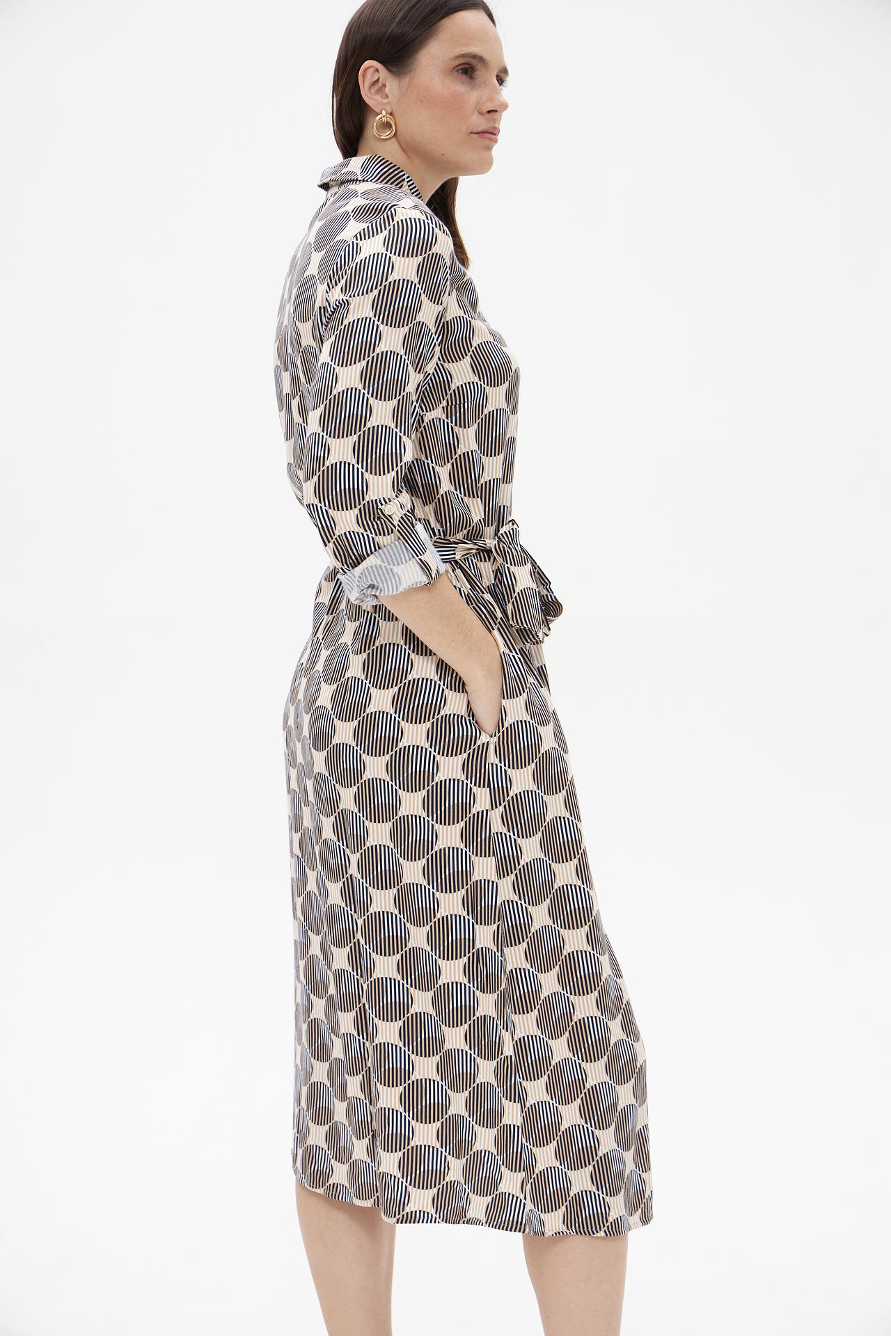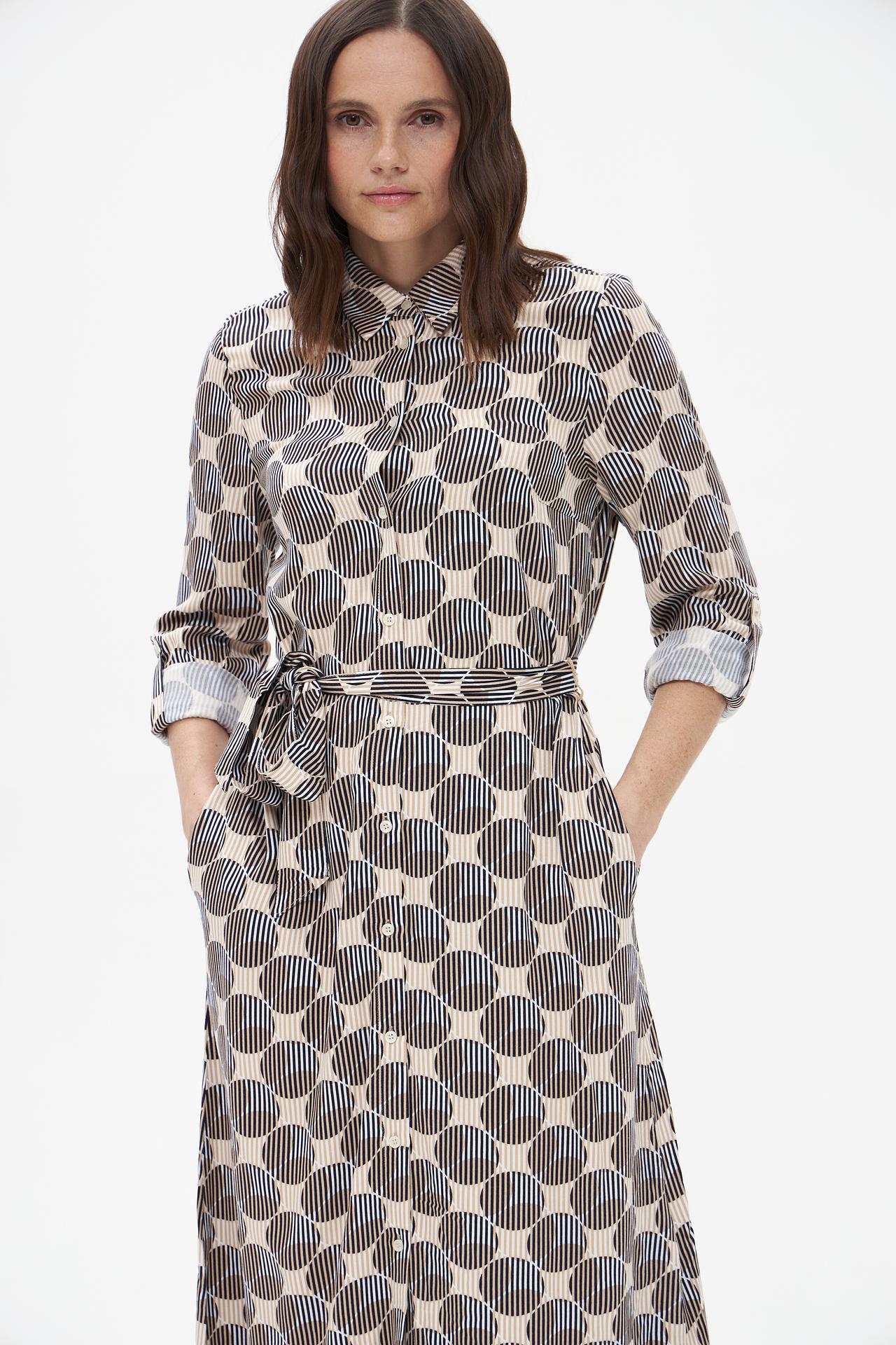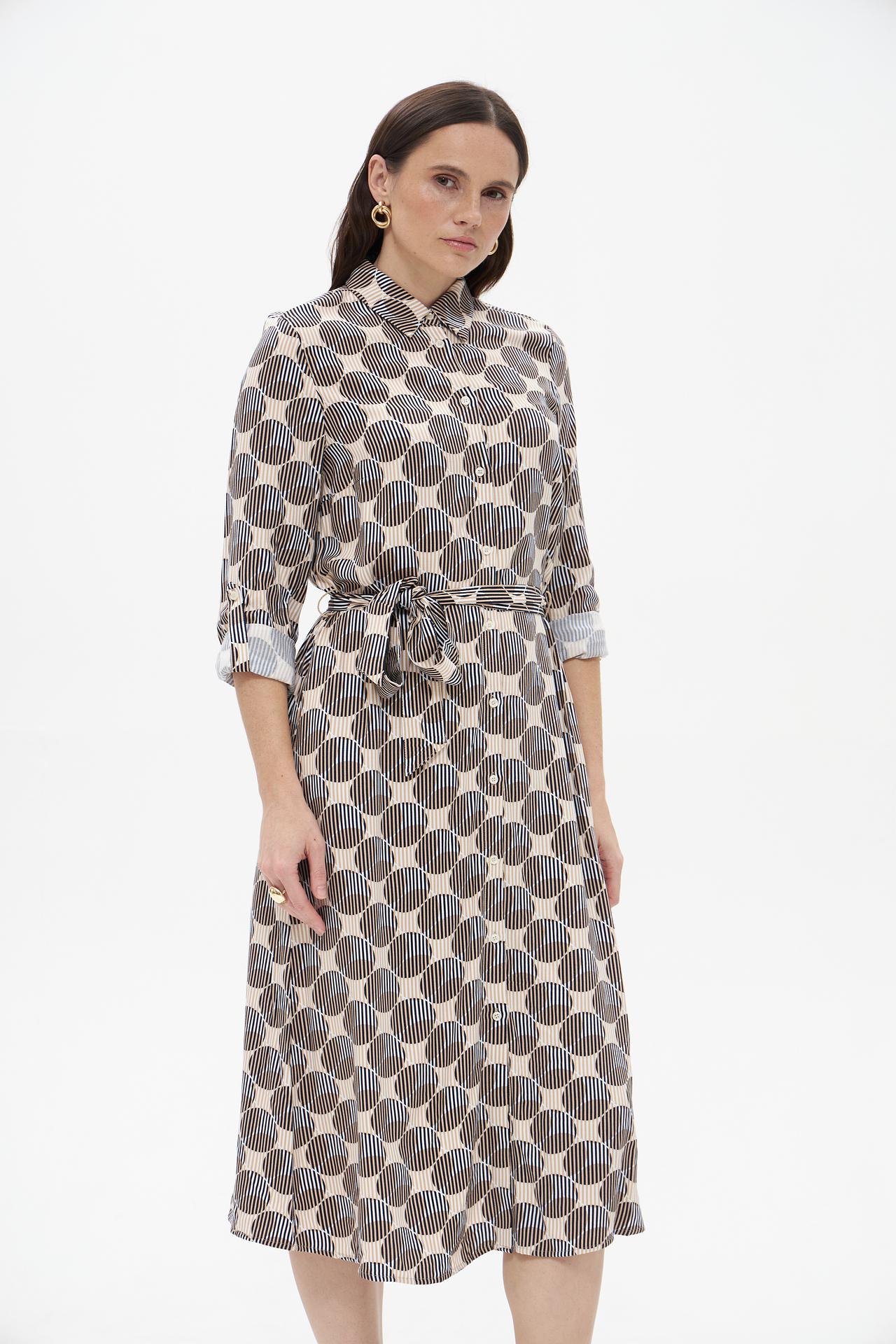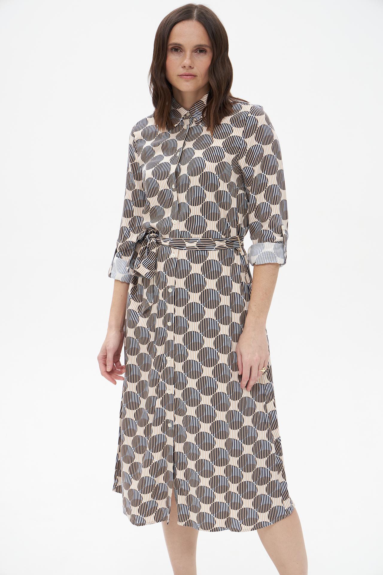 Элегантное платье-рубашка от MORE and MORE станет отличным дополнением вашего гардероба. Изготовленное из 100% вискозы (EcoVero), оно приятно на ощупь и обеспечивает комфорт в течение всего дня. Принт в виде кругов придает образу игривость и оригинальность, а пояс подчеркивает талию, создавая женственный силуэт. Идеальный выбор для создания стильных и запоминающихся образов.