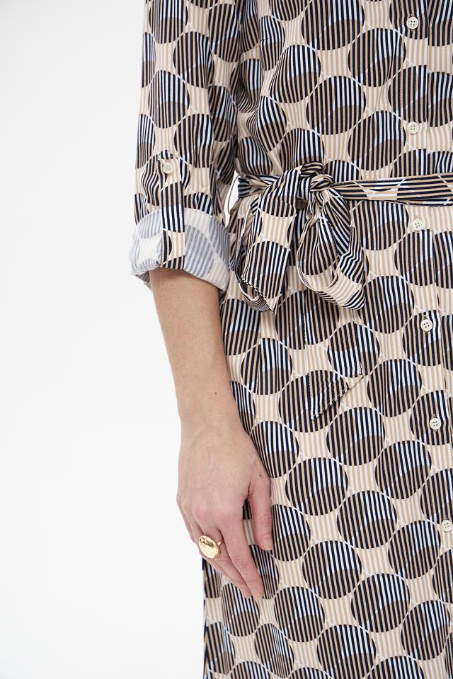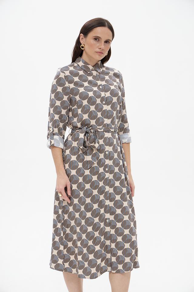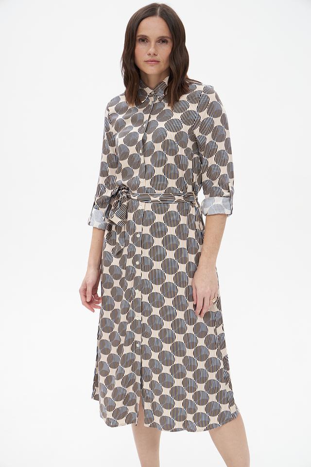 Платье More and More бежевого цвета с оригинальным геометрическим принтом – стильное и комфортное решение для повседневного образа. Модель выполнена из мягкой вискозы и имеет удобный пояс. Состав: вискоза (EcoVero) 100%