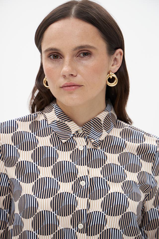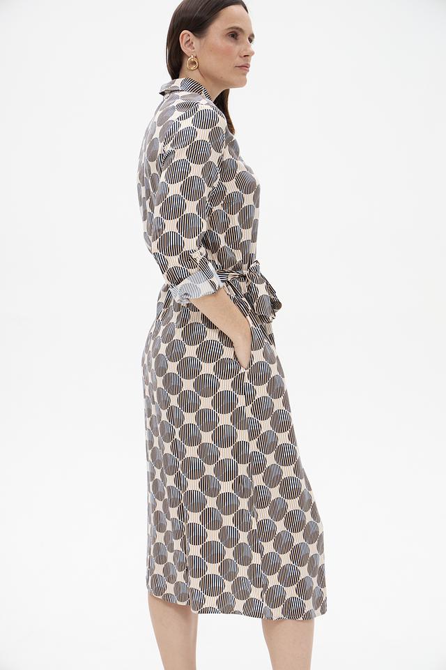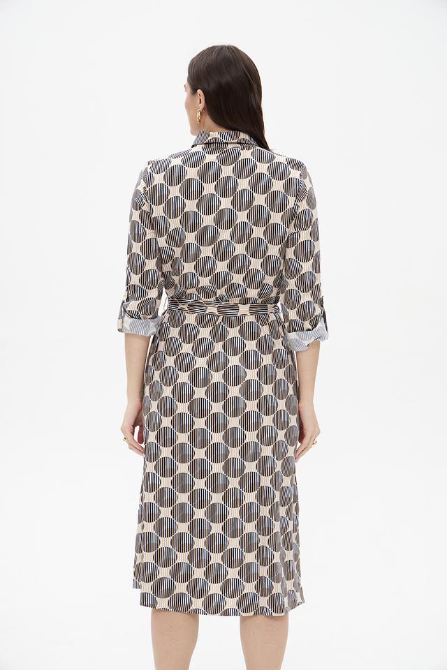 Особенностью этого платья является его оригинальный принт в виде геометрических фигур коричневого и бежевого оттенков. Рукава 3/4 с манжетами добавляют образу изысканности. Платье идеально подходит для создания как повседневных, так и более нарядных образов.
