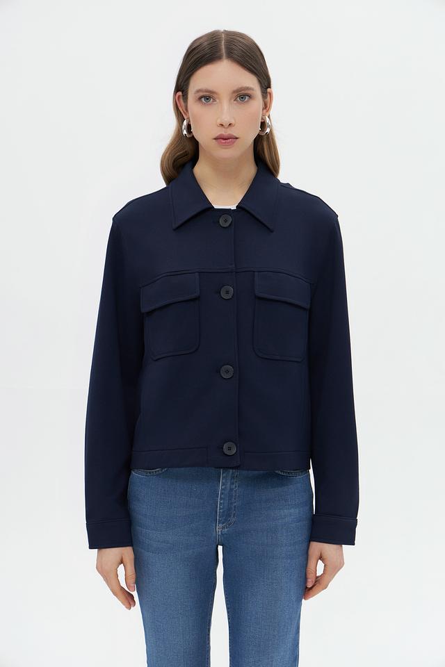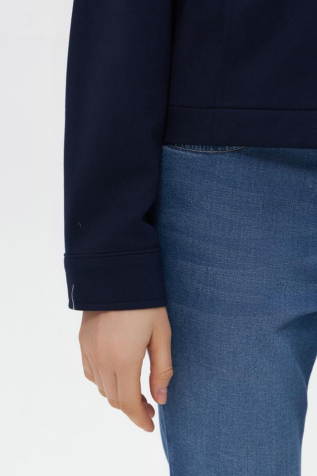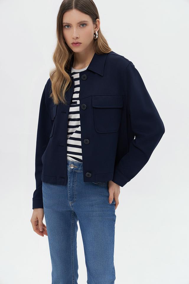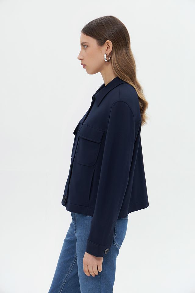 Жакет имеет прямой крой, который обеспечивает комфортную посадку по фигуре. Застежка на пуговицы позволяет регулировать степень прилегания. Накладные карманы добавляют практичности и функциональности.