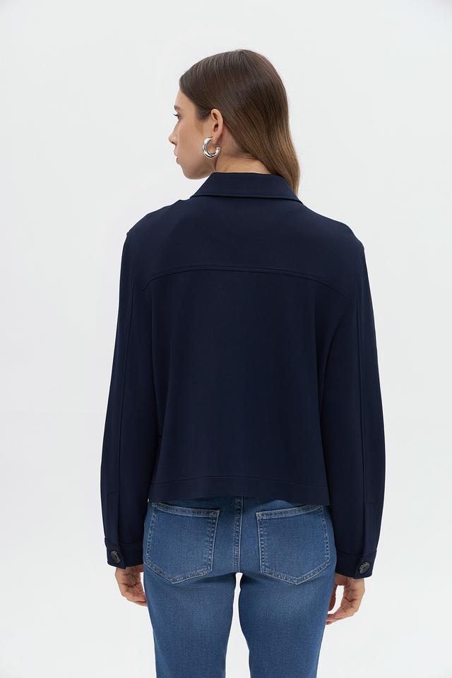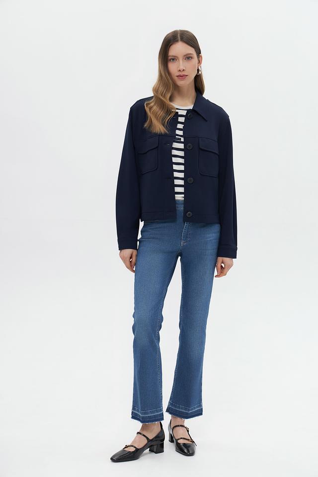 Тёмно-синий жакет MORE and MORE прямого кроя, выполнен из вискозы с добавлением полиамида и эластана. Модель застегивается на пуговицы и имеет накладные карманы. Состав: вискоза 70%, полиамид 25%, эластан 5%