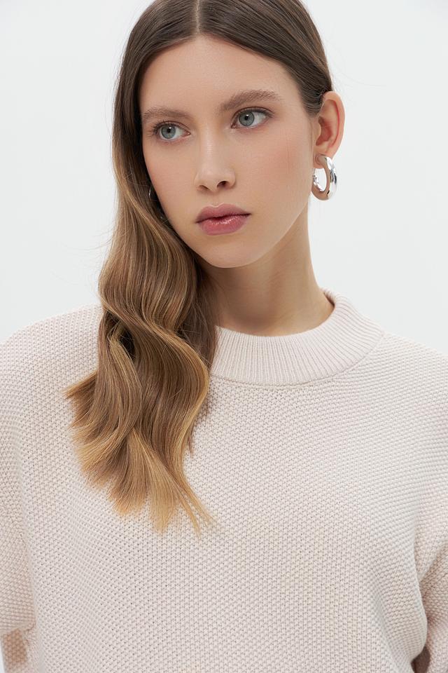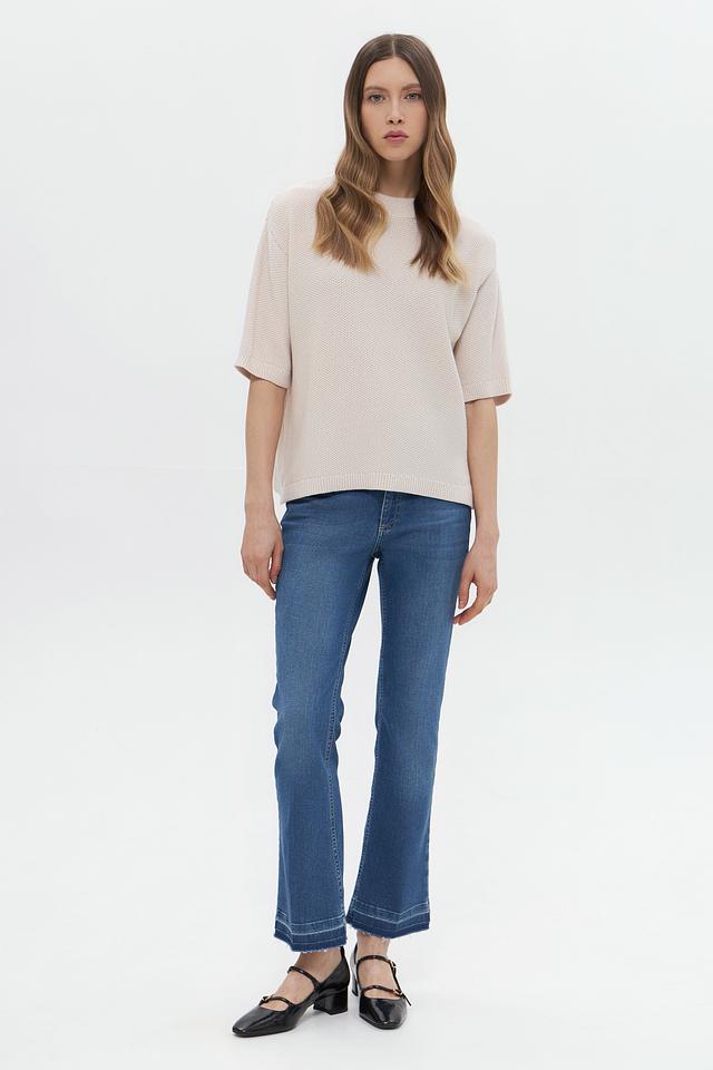 Пуловер имеет свободный крой, короткий рукав и округлый вырез горловины. Текстурная вязка придает изделию особый шарм и делает его более интересным. Состав пуловера включает вискозу, полиэстер и полиамид, что обеспечивает мягкость, комфорт и долговечность.