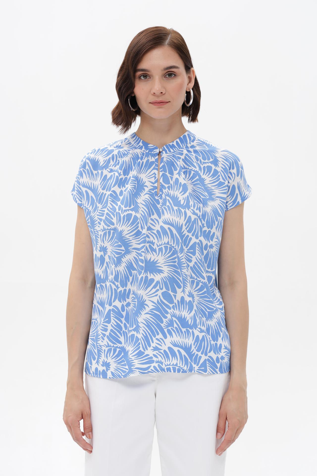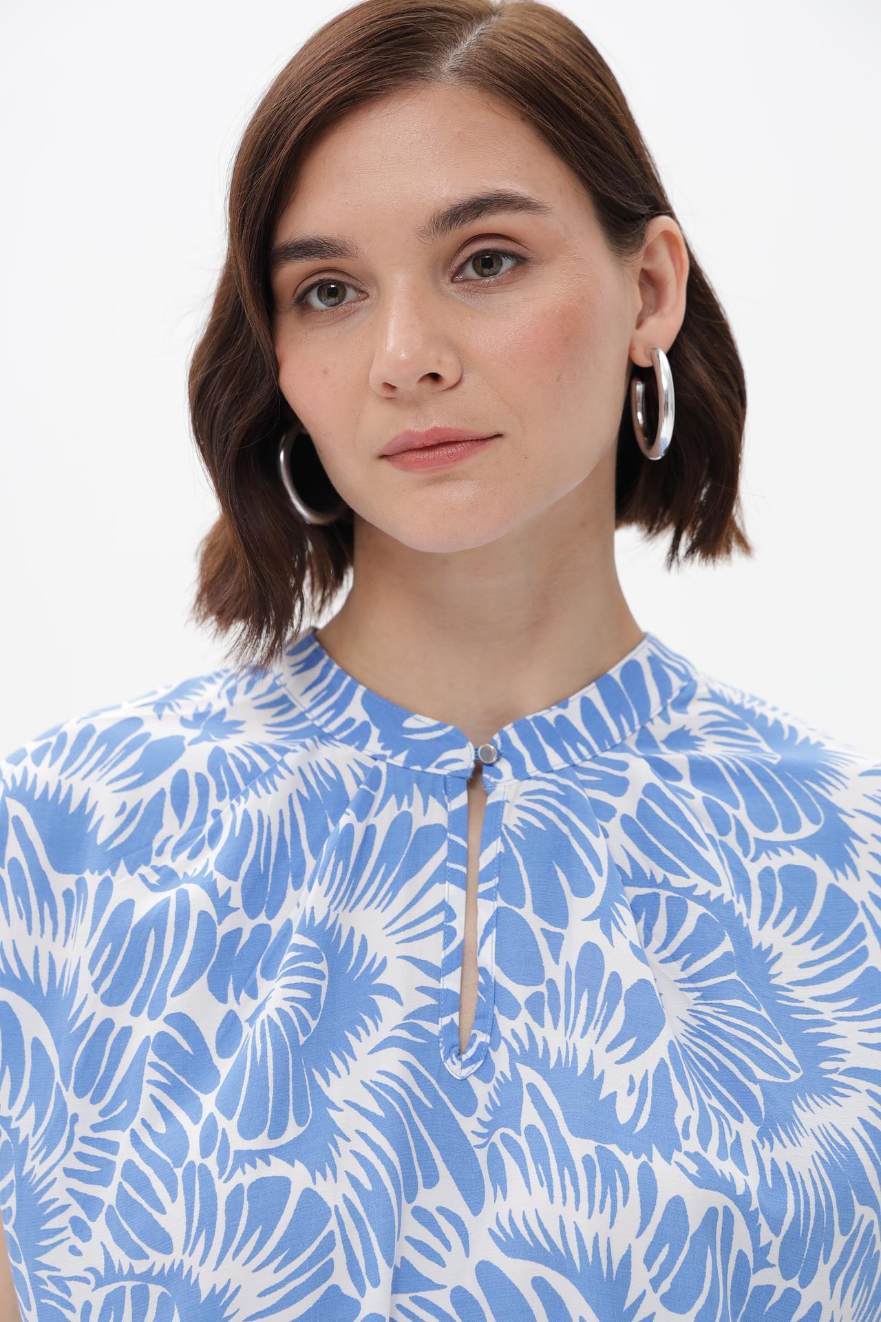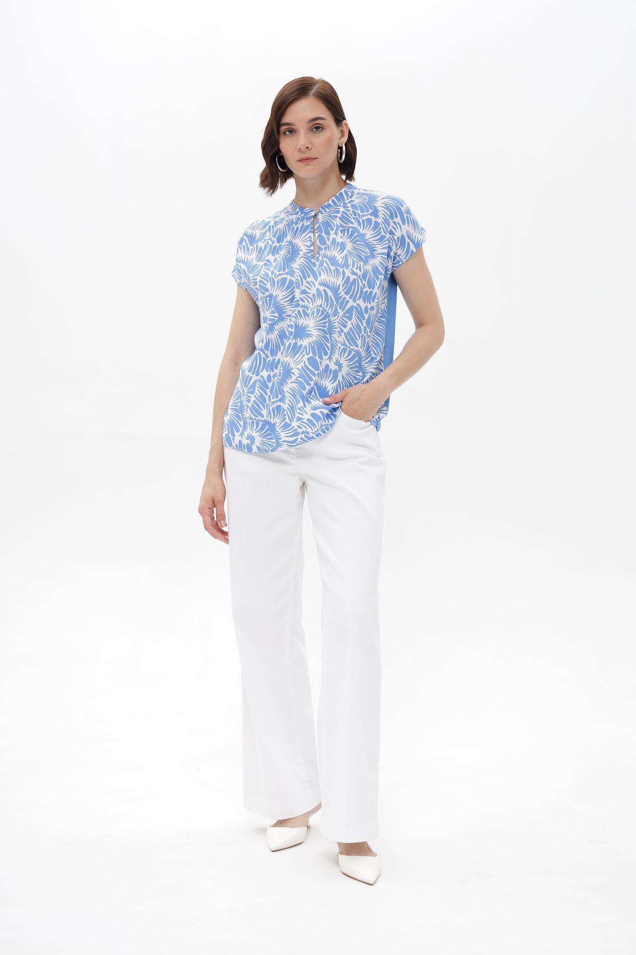 - Элегантный дизайн: Голубая блуза с уникальным белым растительным узором на передней части и рукавах придает изделию свежий и современный вид. Спинка выполнена в однотонном голубом цвете, создавая интересный контраст.