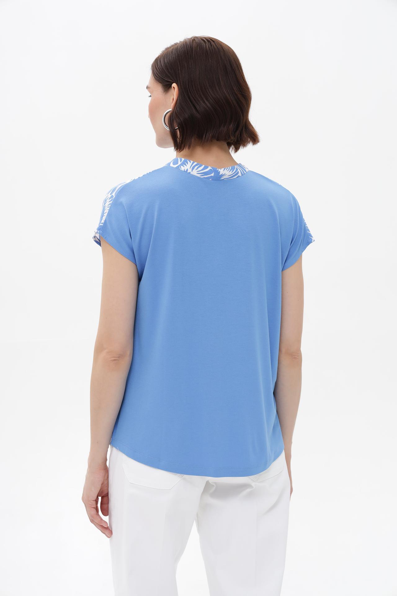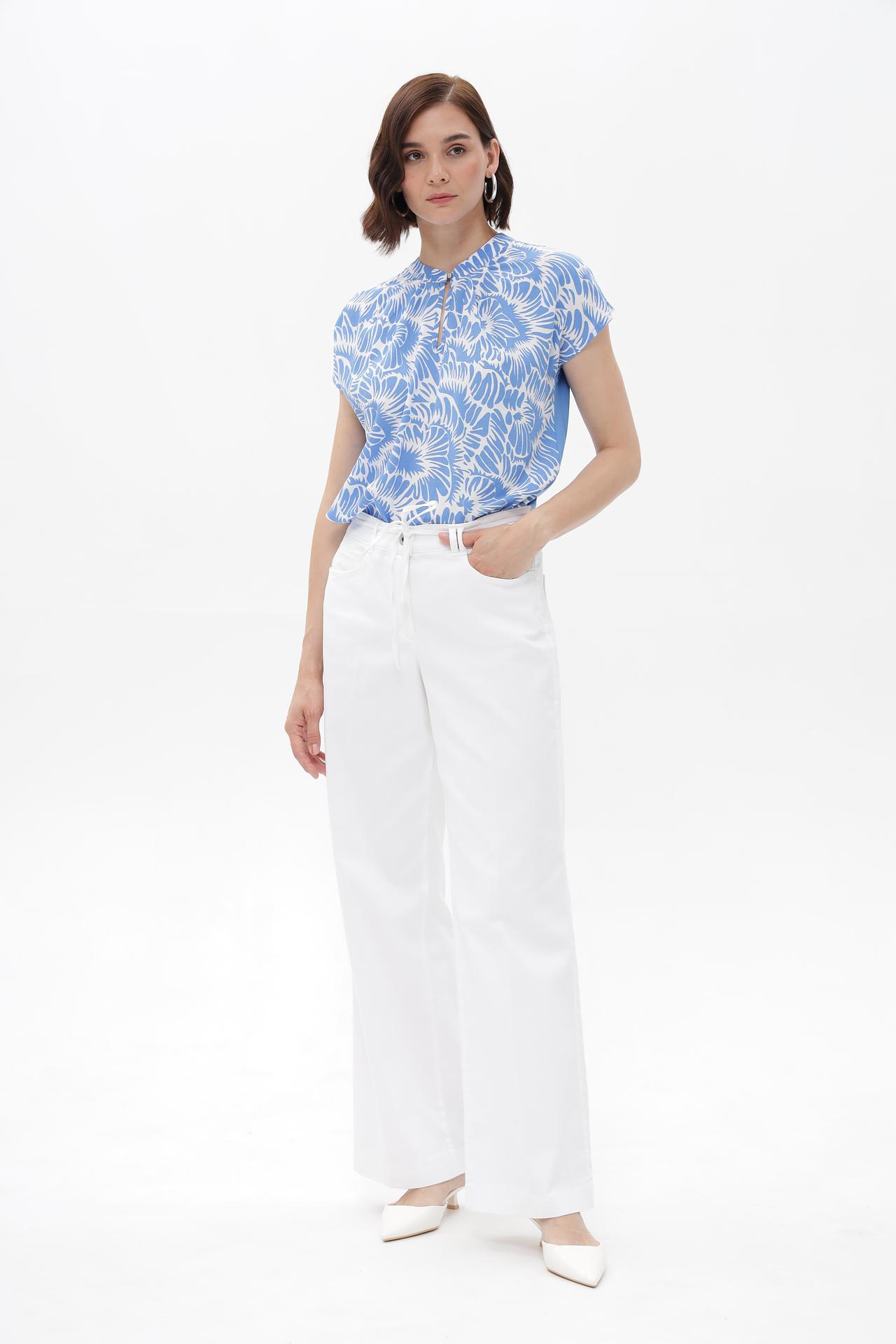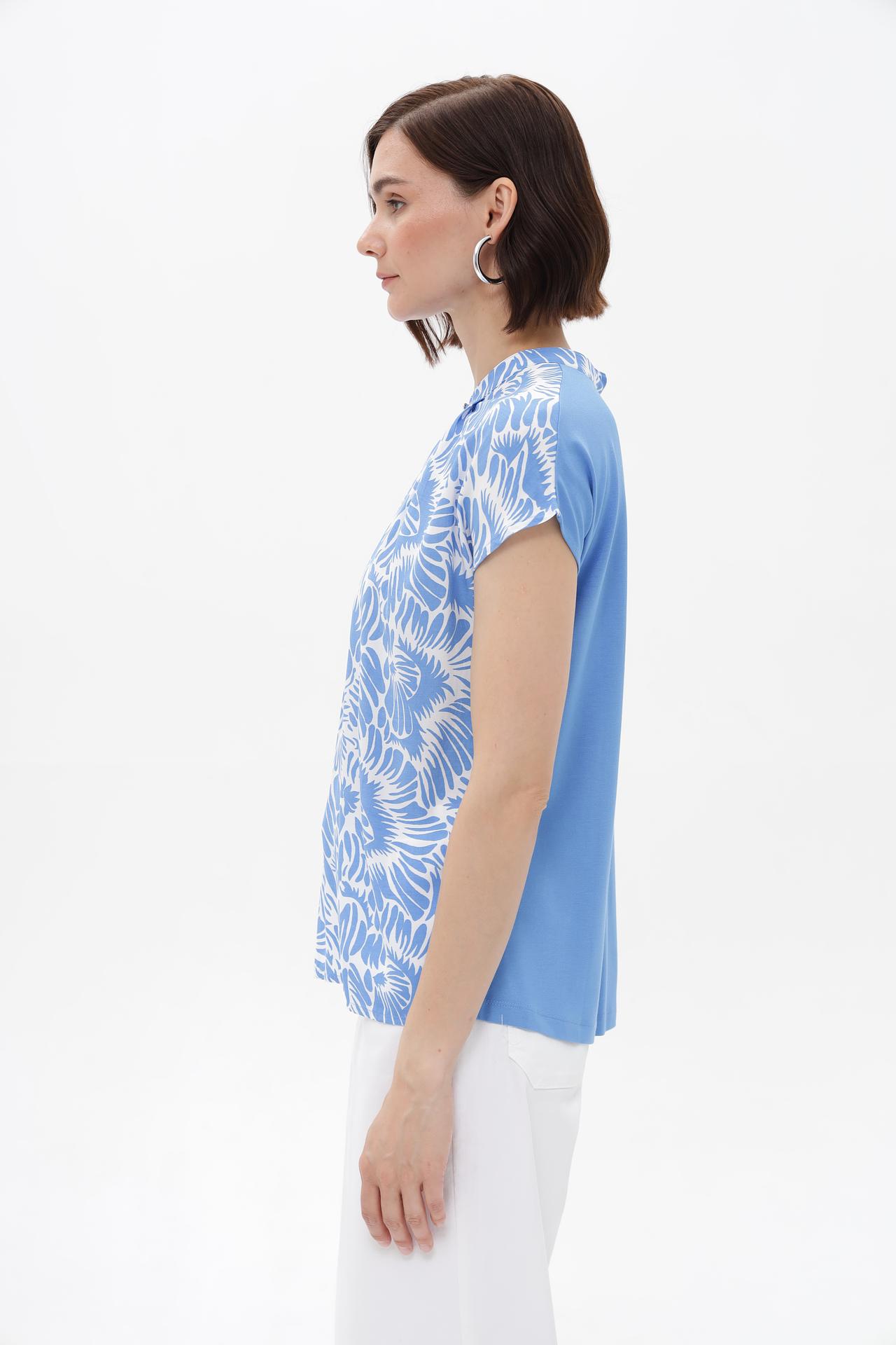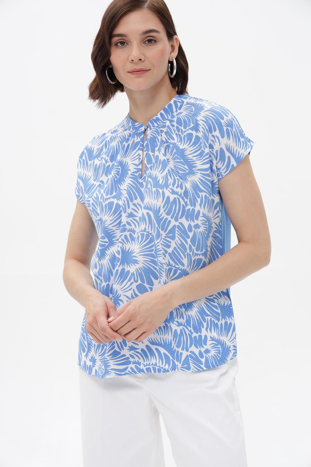 - Элегантный дизайн: Голубая блуза с уникальным белым растительным узором на передней части и рукавах придает изделию свежий и современный вид. Спинка выполнена в однотонном голубом цвете, создавая интересный контраст.