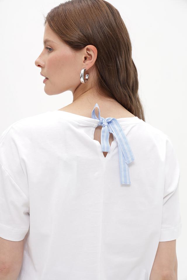 Блузка имеет свободный крой, который обеспечивает комфортную посадку по фигуре. Короткие рукава и круглый вырез делают ее идеальной для теплой погоды. Завязки на спине добавляют образу изящества и позволяют регулировать посадку.