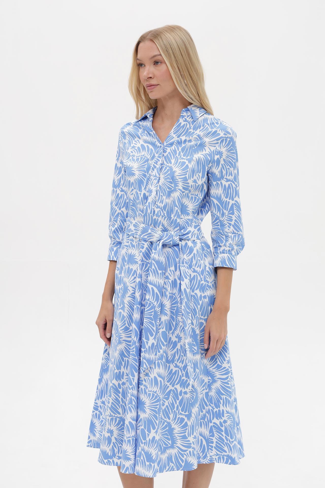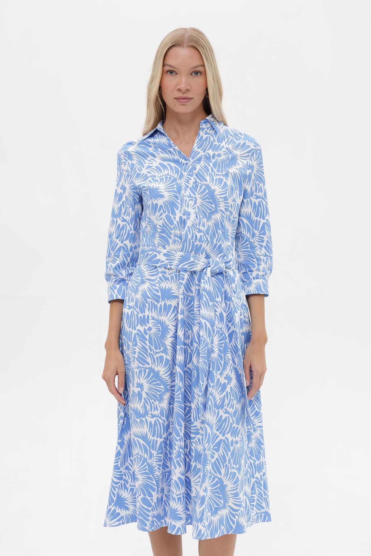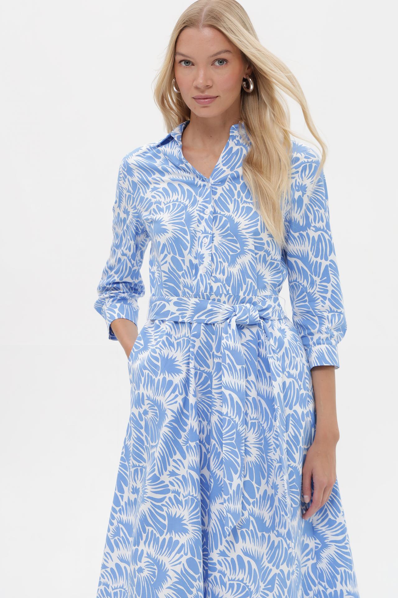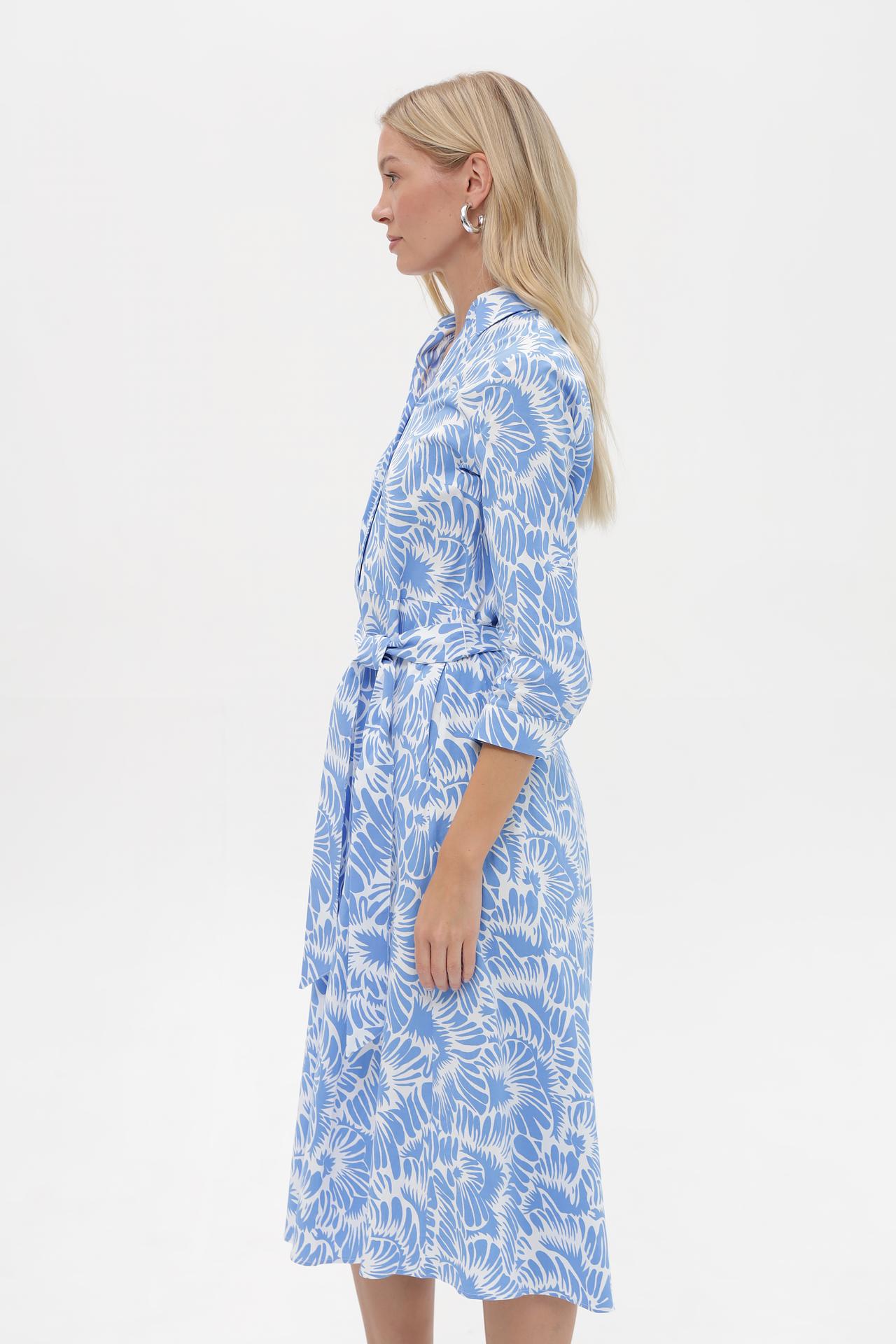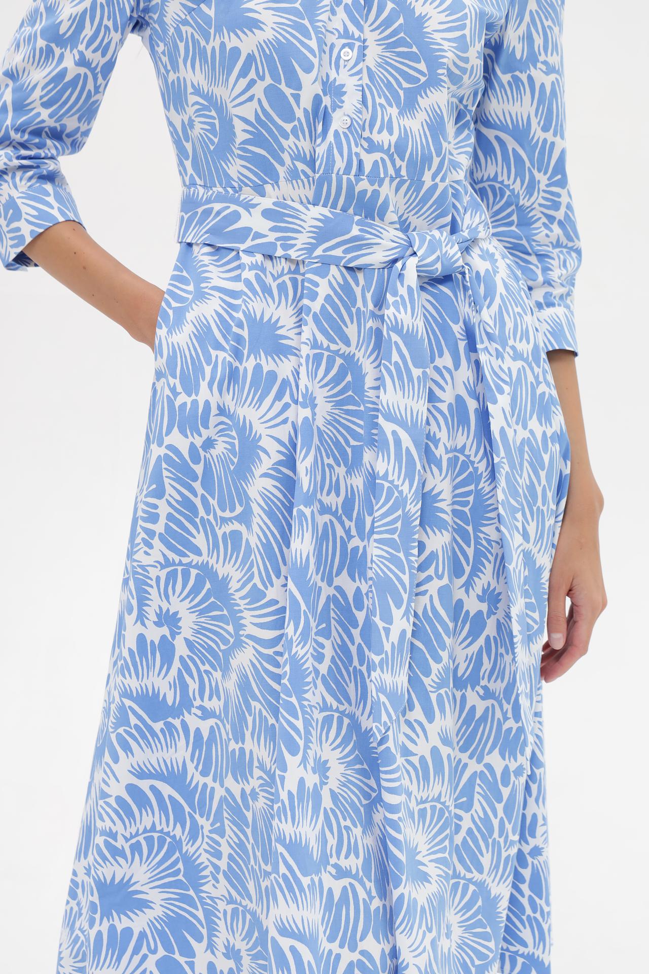 - Принт и цвет: Голубое платье с белым абстрактным узором придает образу свежести и легкости, делая его ярким акцентом вашего стиля. Рисунок визуально стройнит.