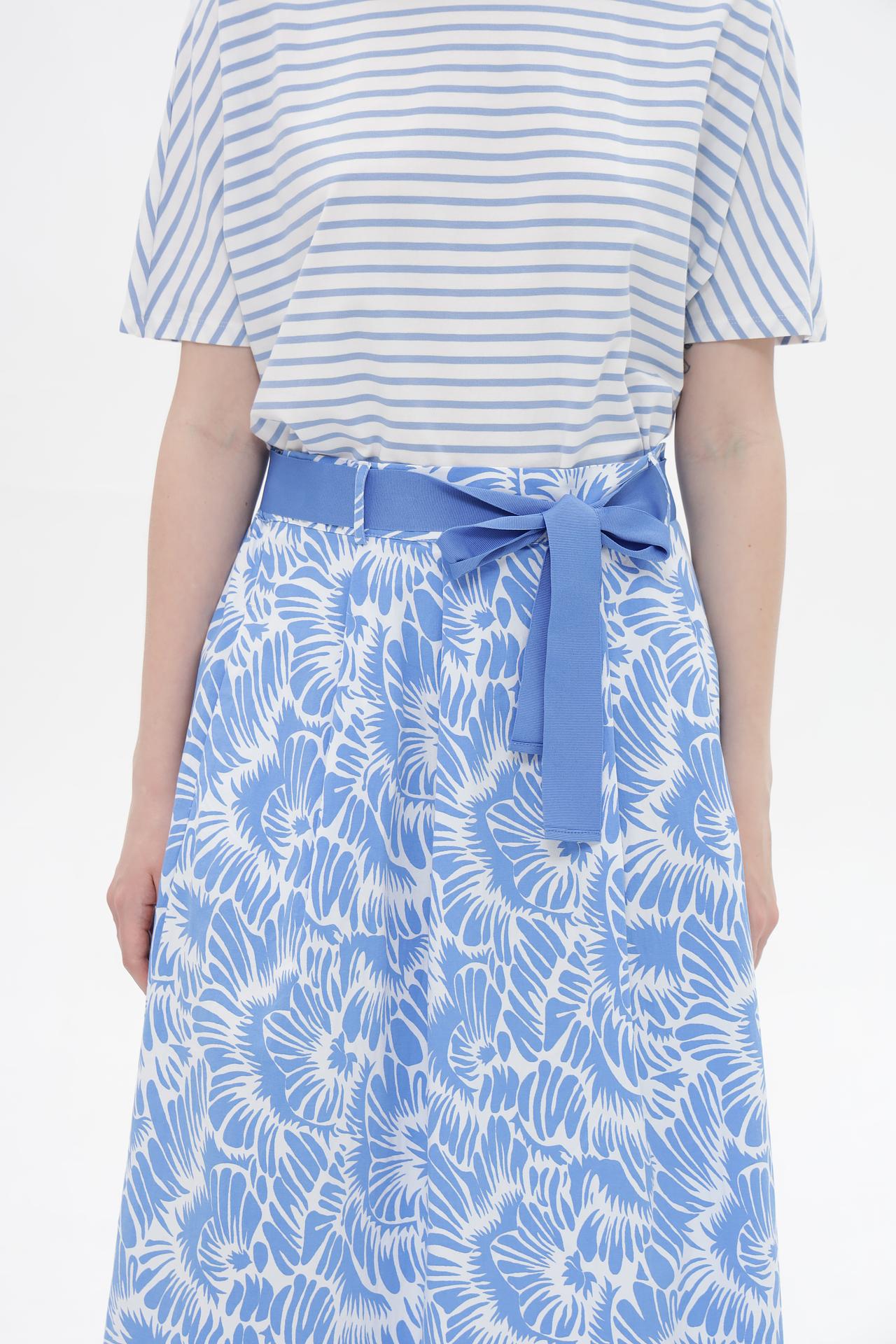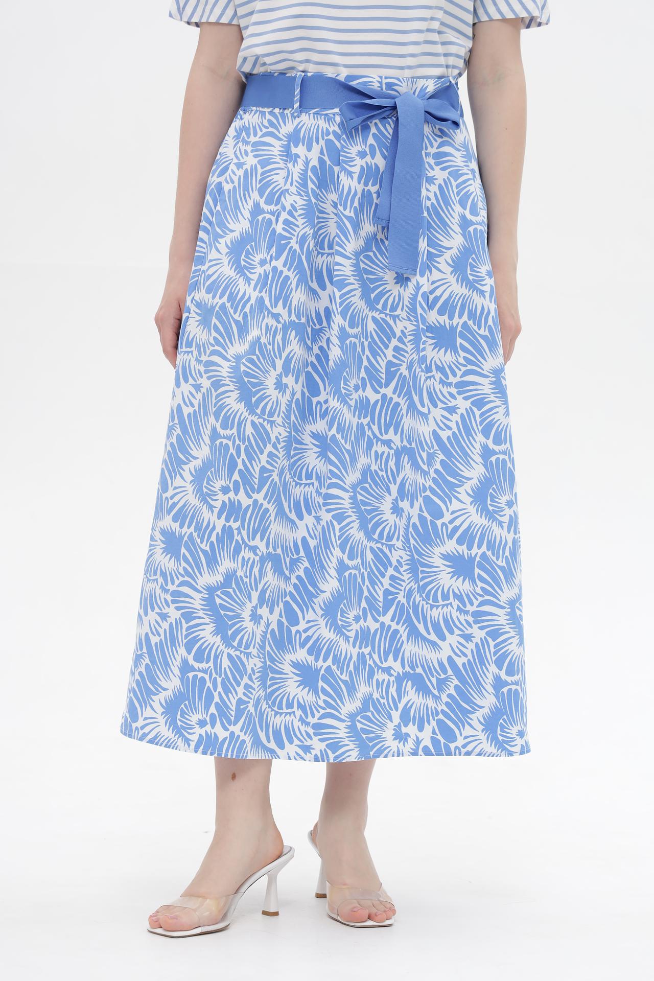 - Элегантный дизайн: Юбка выполнена в насыщенном голубом цвете с контрастным белым растительным узором. Классический А-силуэт и длина миди делают ее универсальной для различных типов фигур.