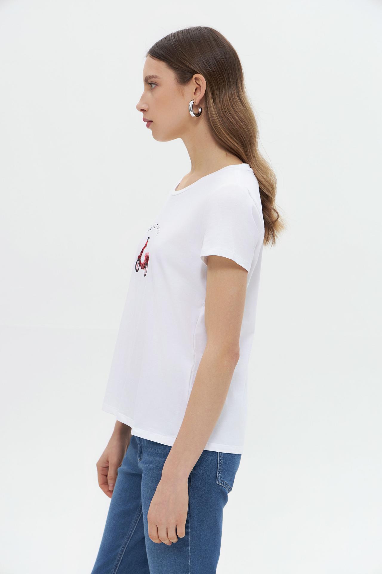 Особенностью этой футболки является оригинальный принт в виде скутера, который добавит вашему образу нотку игривости и индивидуальности. Эта футболка станет прекрасным дополнением к вашему гардеробу, позволяя создавать разнообразные стильные комбинации.