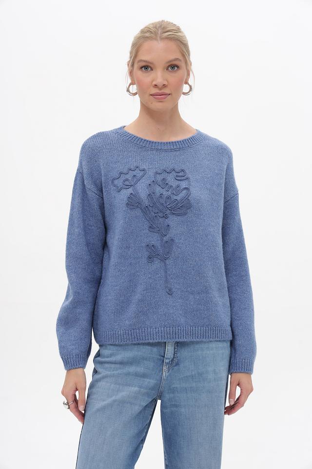 Особенности дизайна: пуловер украшен вышивкой в виде стилизованного цветочного мотива, расположенного на лицевой стороне. Вырез горловины – круглый. Рукава – длинные. Крой – свободный, не сковывающий движения.