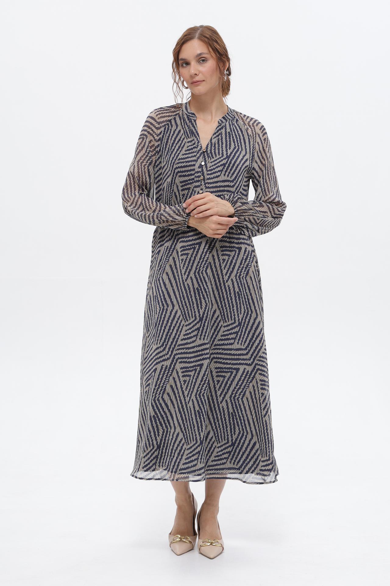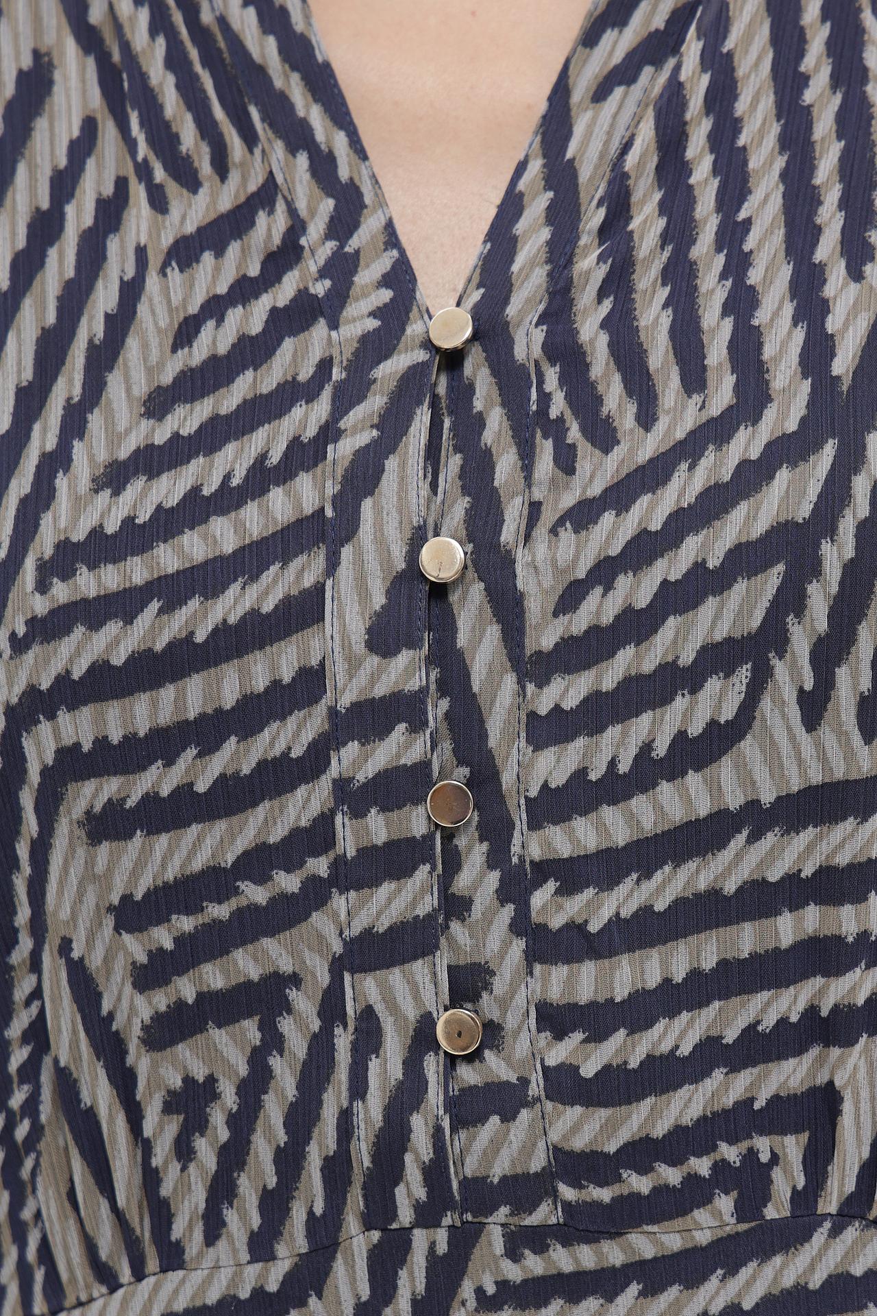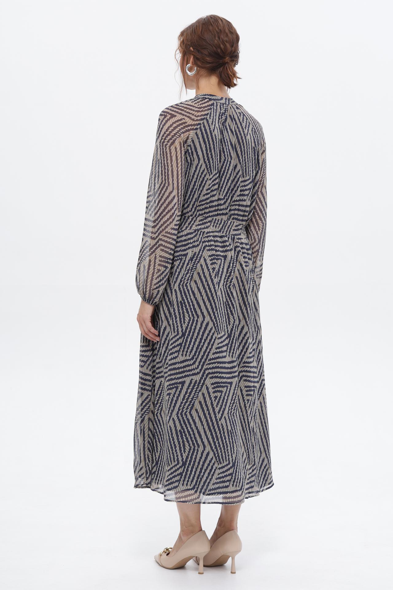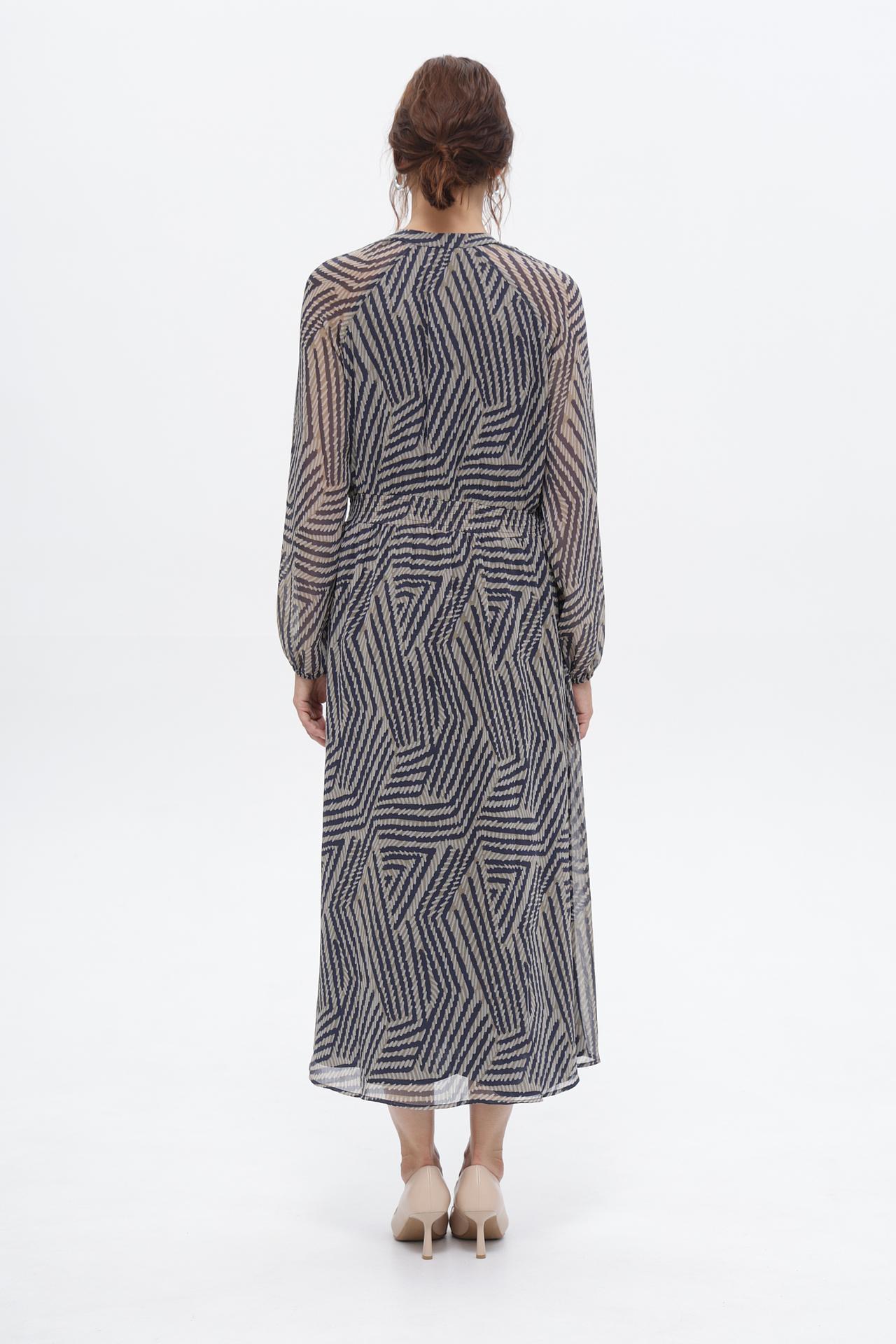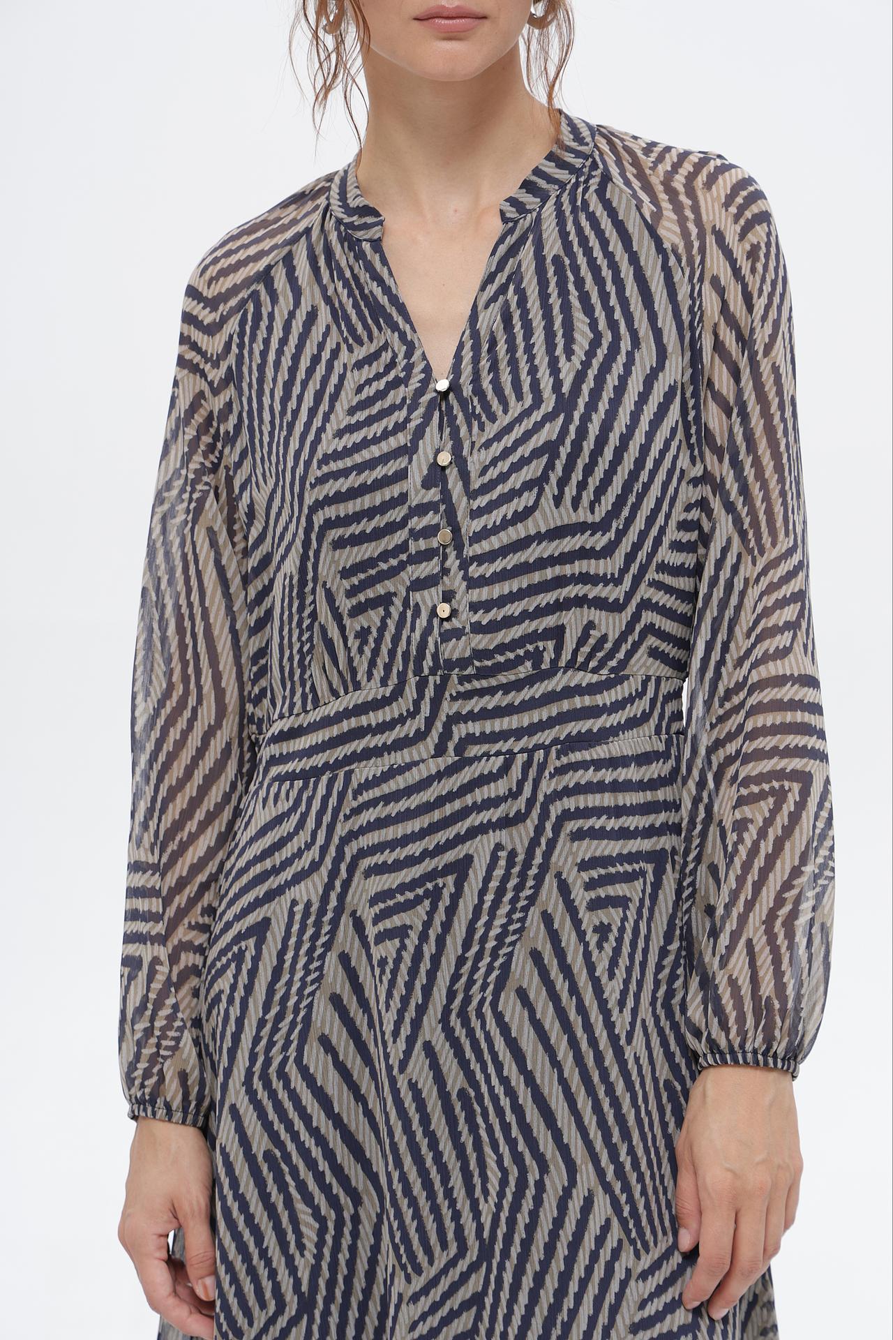 - Принт: Современный геометрический узор в темно-синих и бежевых тонах. Принт визуально стройнит и делает образ более выразительным.