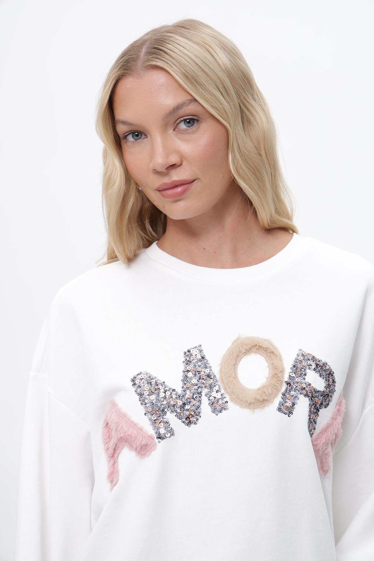 - Дизайн: Свободный крой и минималистичный белый цвет делают пуловер универсальным элементом гардероба. Оригинальная аппликация из пайеток и нежного меха придает изделию изысканность и игривость.
