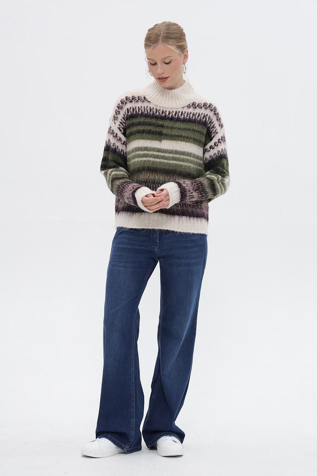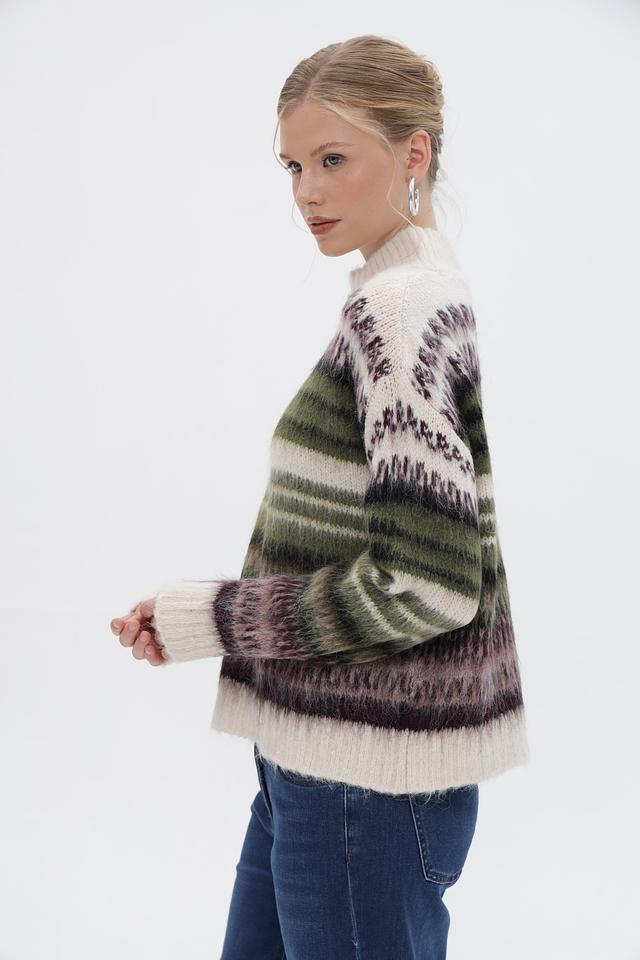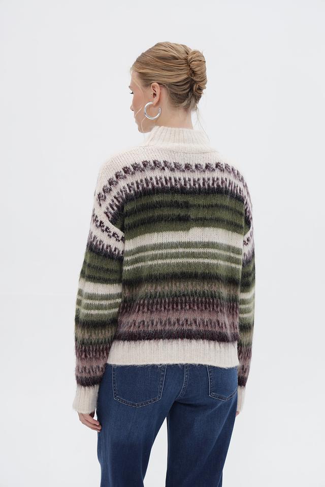 Основным акцентом пуловера является яркий полосатый узор, сочетающий в себе оттенки зелёного, коричневого и фиолетового. Такой принт добавит динамики и оригинальности вашему образу.