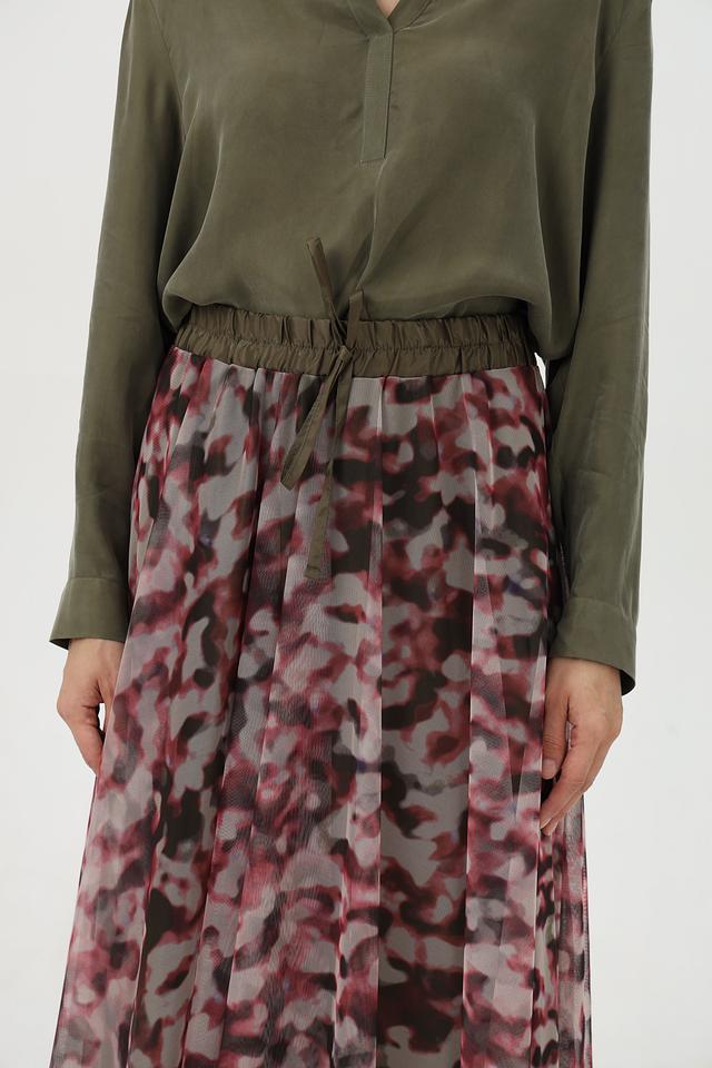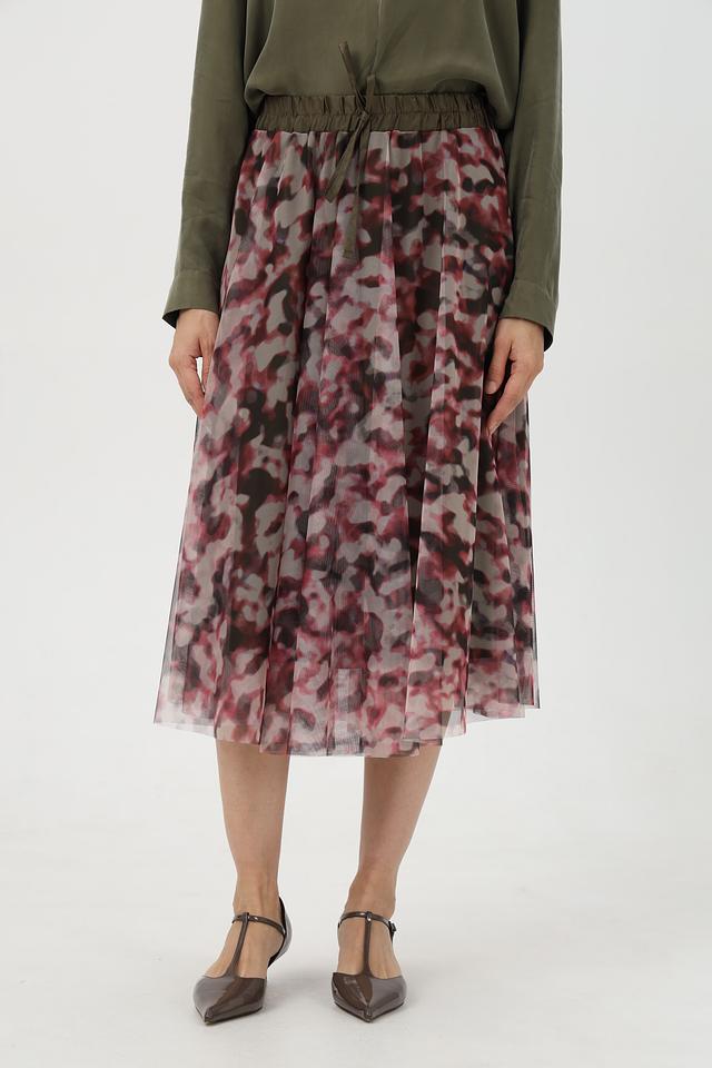 Юбка More and More красного цвета с оригинальным принтом. Модель выполнена из полиэстера, имеет длину миди и сборку на талии с кулиской. Состав: полиэстер 100%
