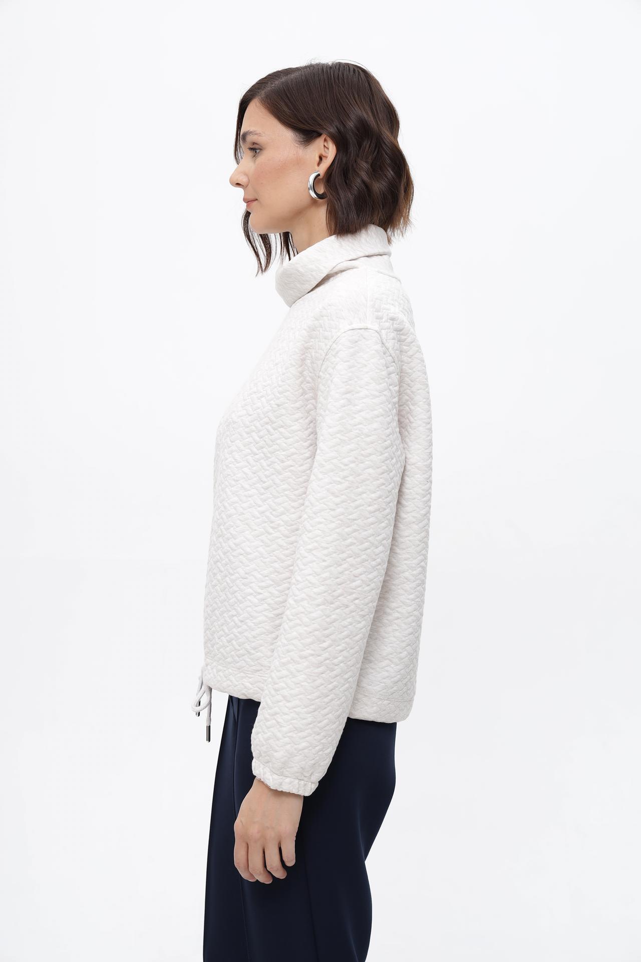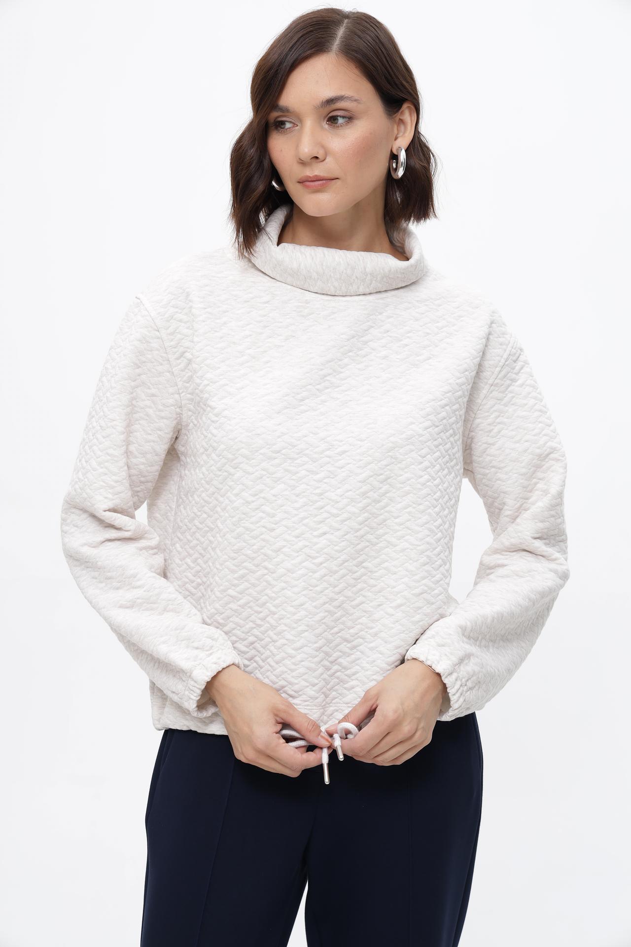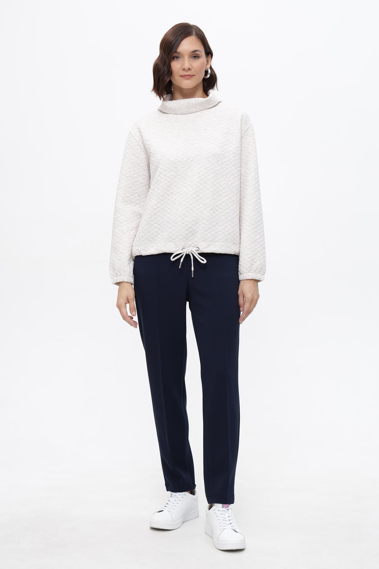 - Практичность: Регулируемая кулиска по низу позволяет акцентировать талию или создать более свободный вид. Пуловер легко сочетается с различными элементами гардероба.