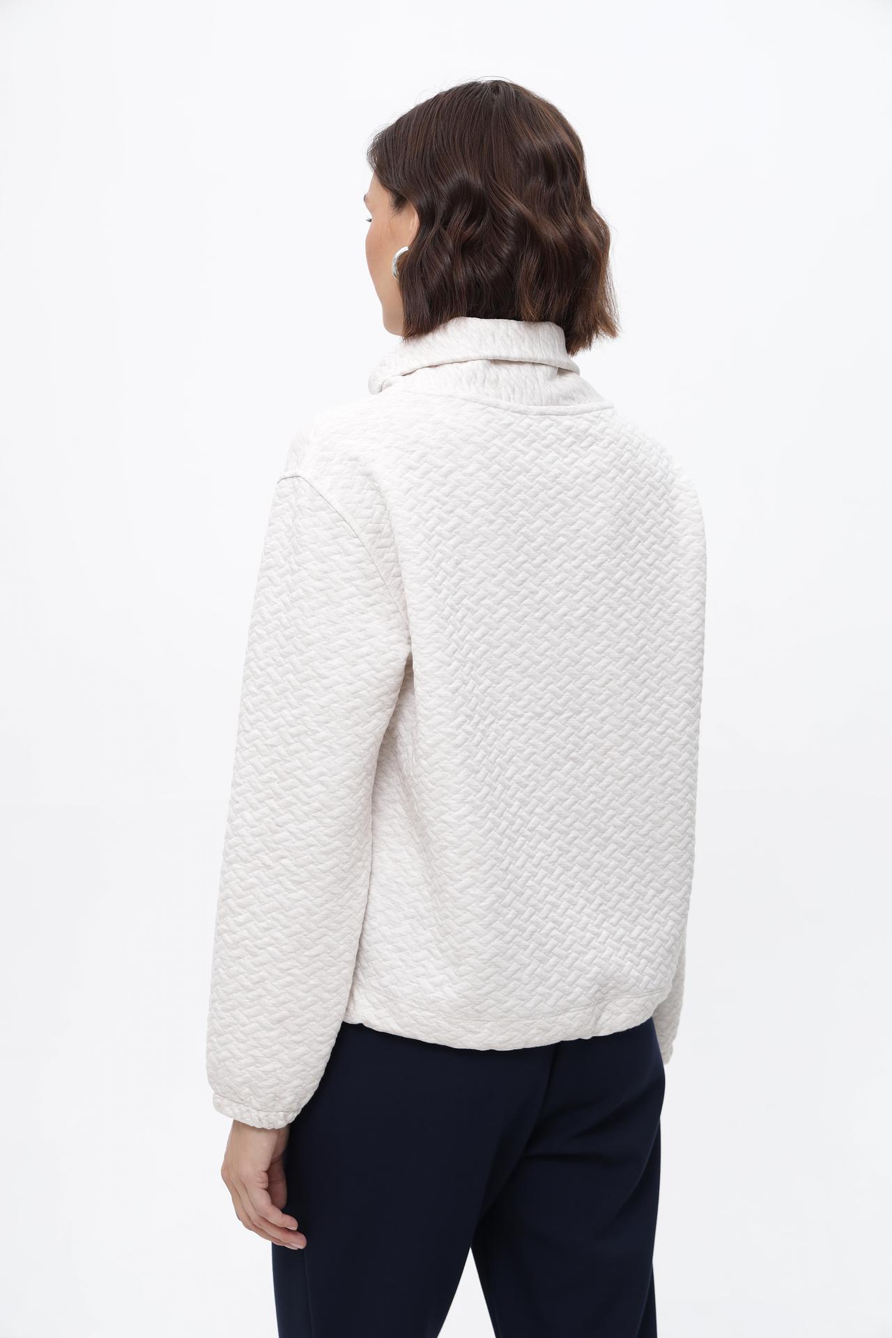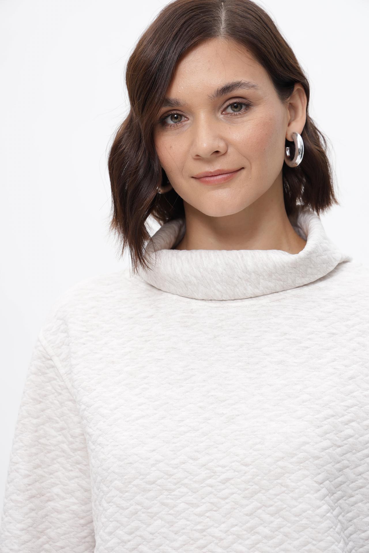 - Дизайн: Высокий воротник-гольф и объемные рукава создают современный и элегантный силуэт. Фактурная вязка добавляет изысканности.
