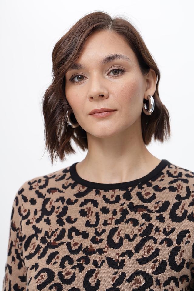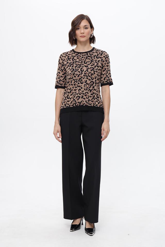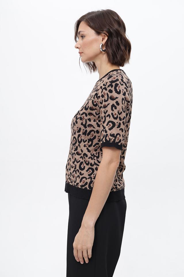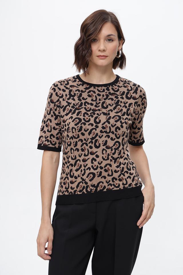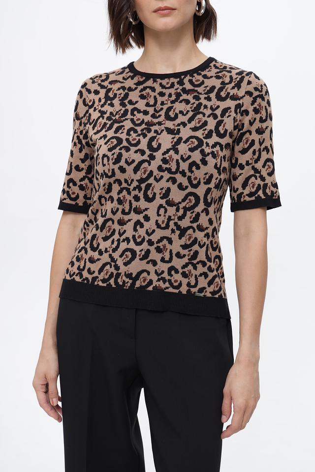 Бежевый пуловер More and More с короткими рукавами и принтом «леопард» выполнен из мягкой вискозы с добавлением полиамида. Удобная модель для создания повседневных образов. Состав: вискоза 83%, полиамид 17%