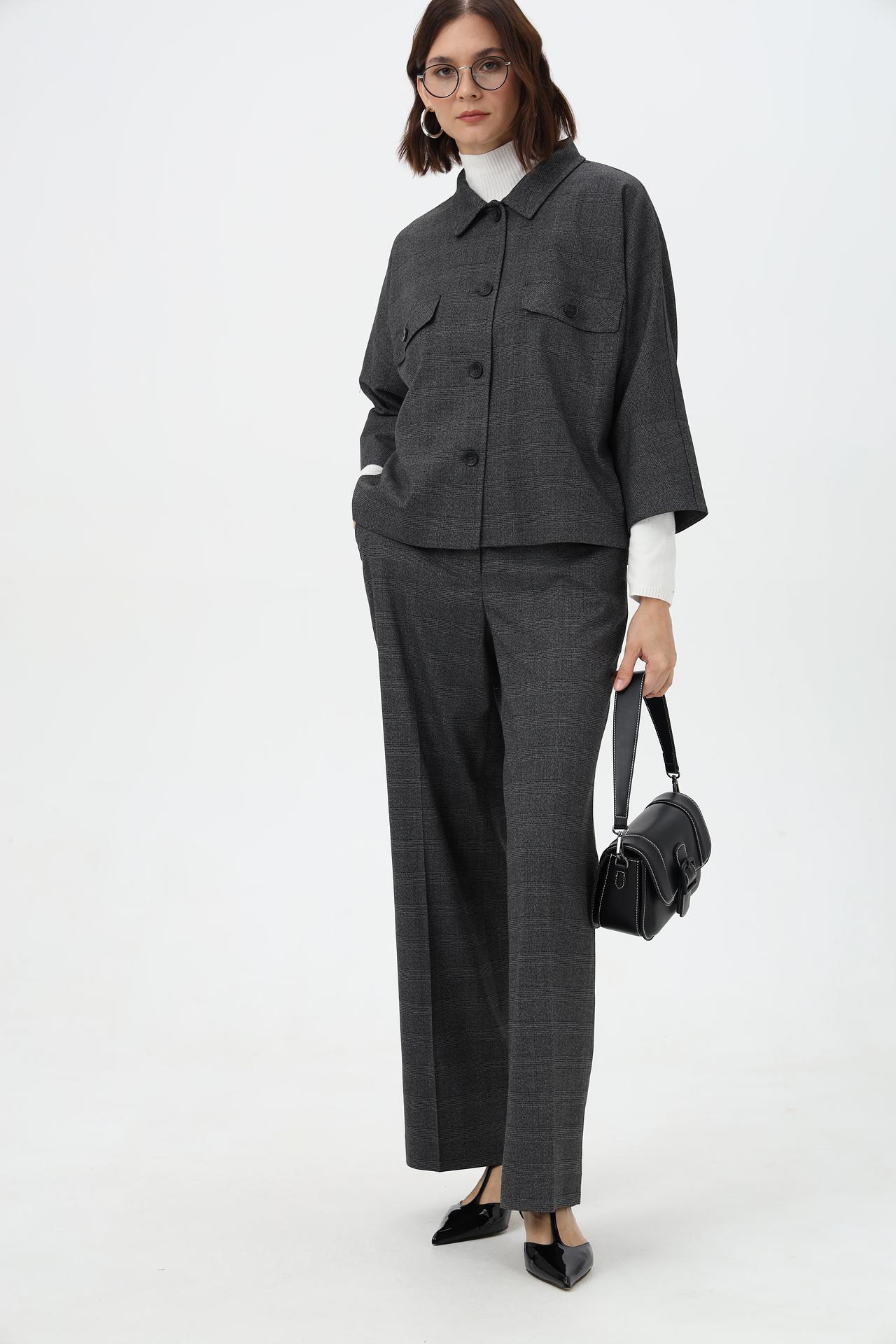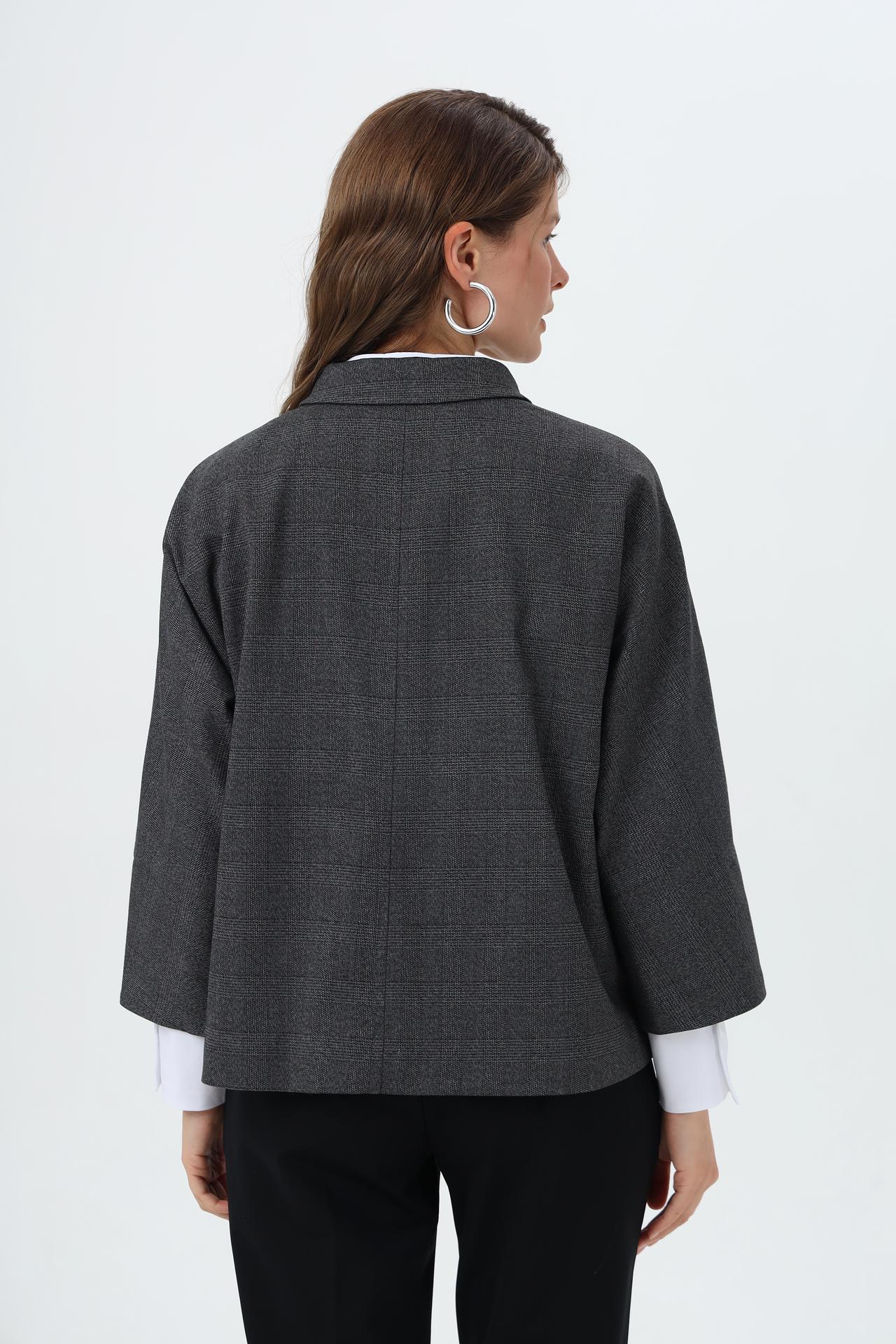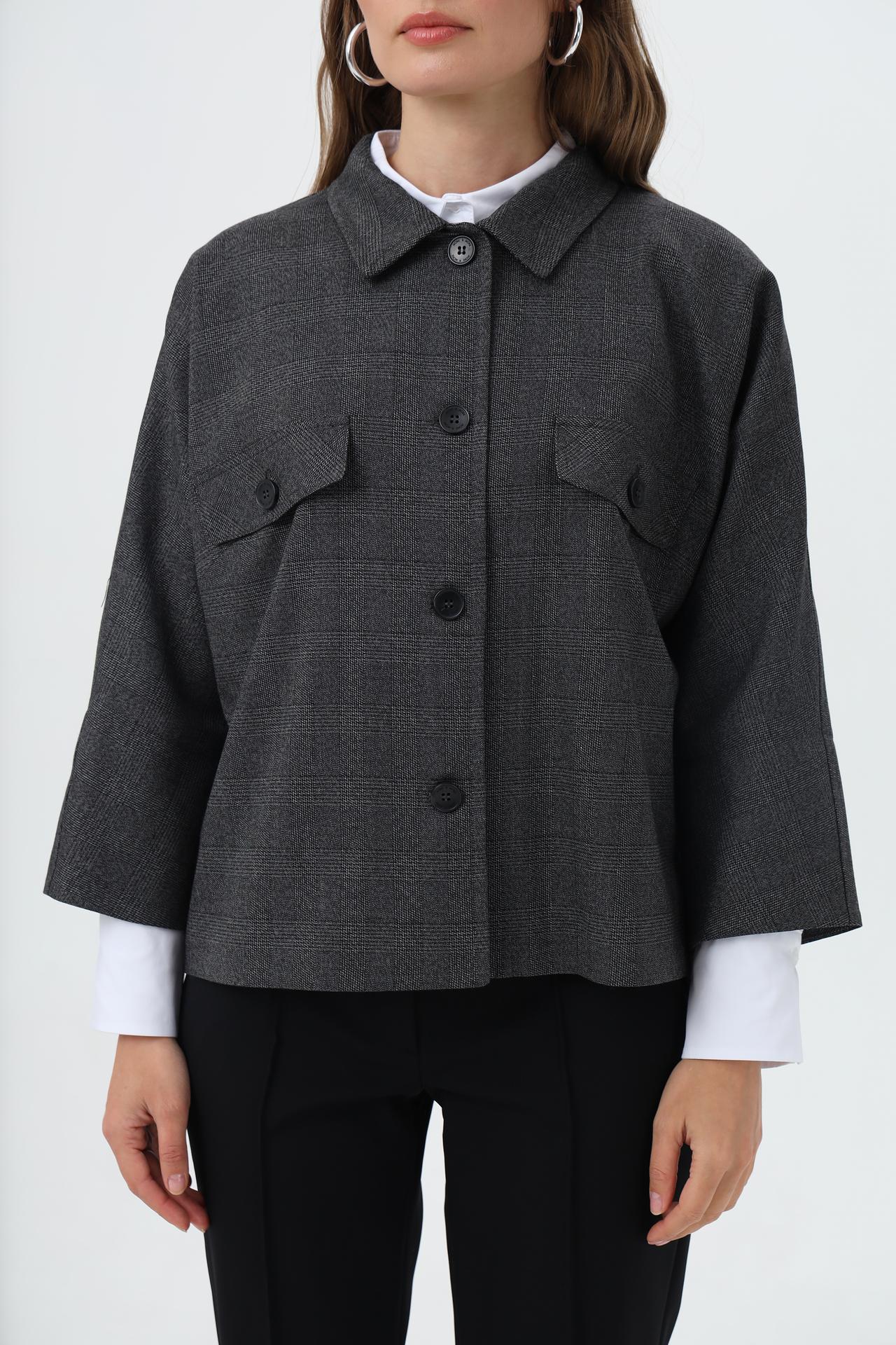 - Цветовая гамма: Глубокий серый цвет в мелкую клетку легко сочетается с другими элементами гардероба, делая жакет универсальным.
