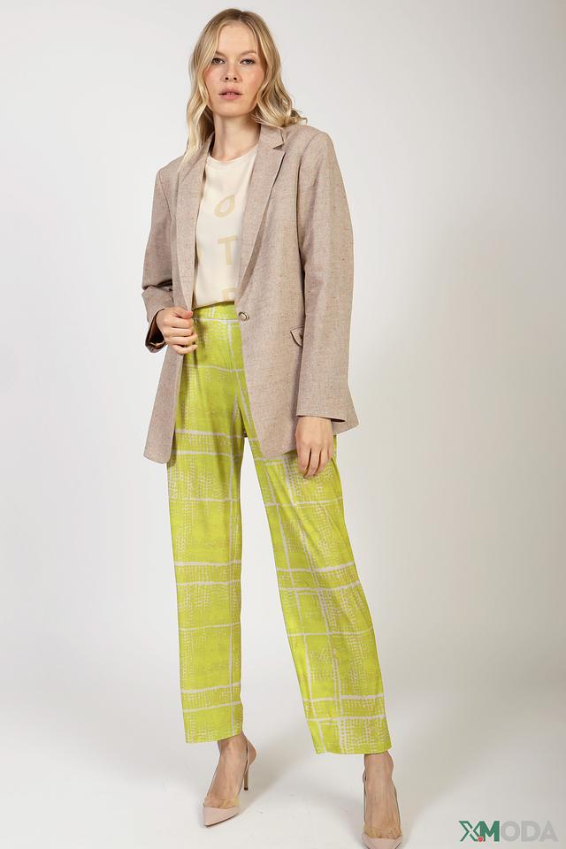 Жакет имеет прямой крой, который обеспечивает комфортную посадку по фигуре. Длинные рукава и лацканы придают ему классический вид. Застежка на одну пуговицу позволяет легко надевать и снимать жакет.