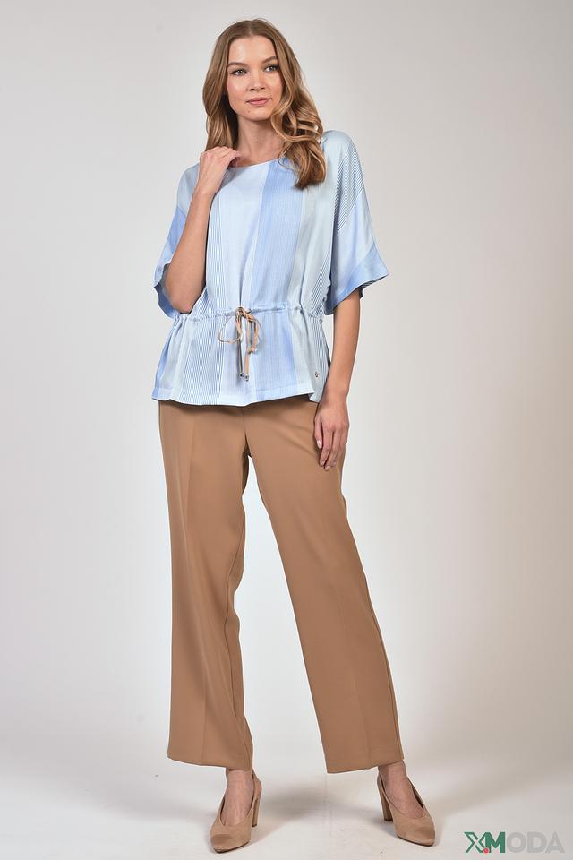 Брюки имеют прямой крой и широкие штанины, что обеспечивает свободу движений и создает современный силуэт. Высокая посадка подчеркивает талию и визуально удлиняет ноги. Эластичный пояс с утяжкой обеспечивает комфортную и надежную посадку.