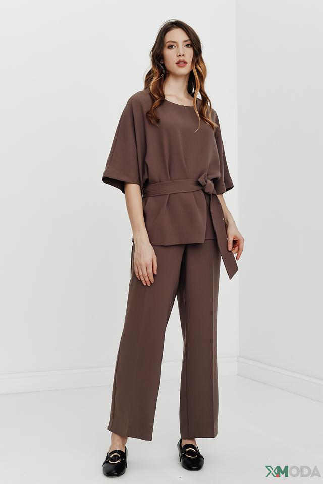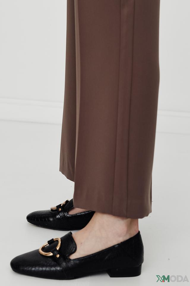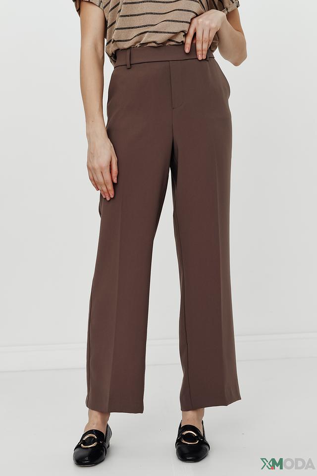 Брюки имеют классический крой с прямыми штанинами и завышенной талией, что обеспечивает комфортную посадку и визуально удлиняет ноги. Пояс подчеркивает талию и добавляет элегантности. Ткань, состоящая из 100% полиэстера, приятна на ощупь и не требует сложного ухода.