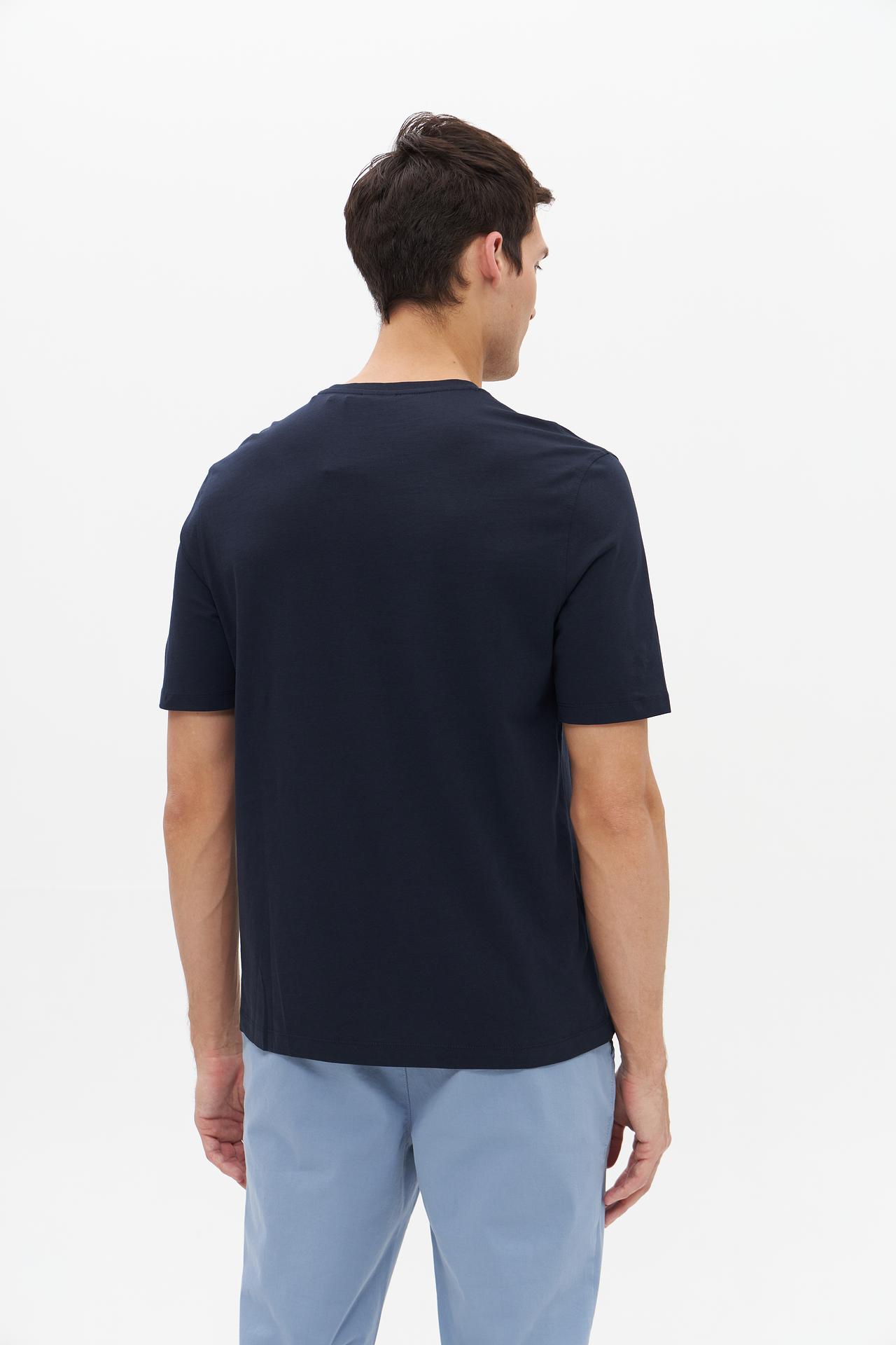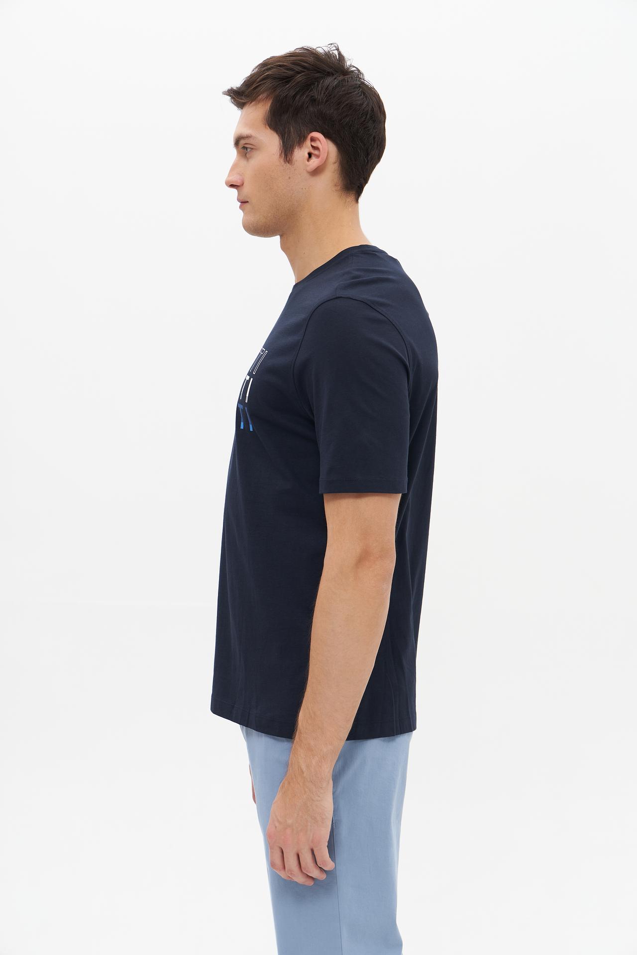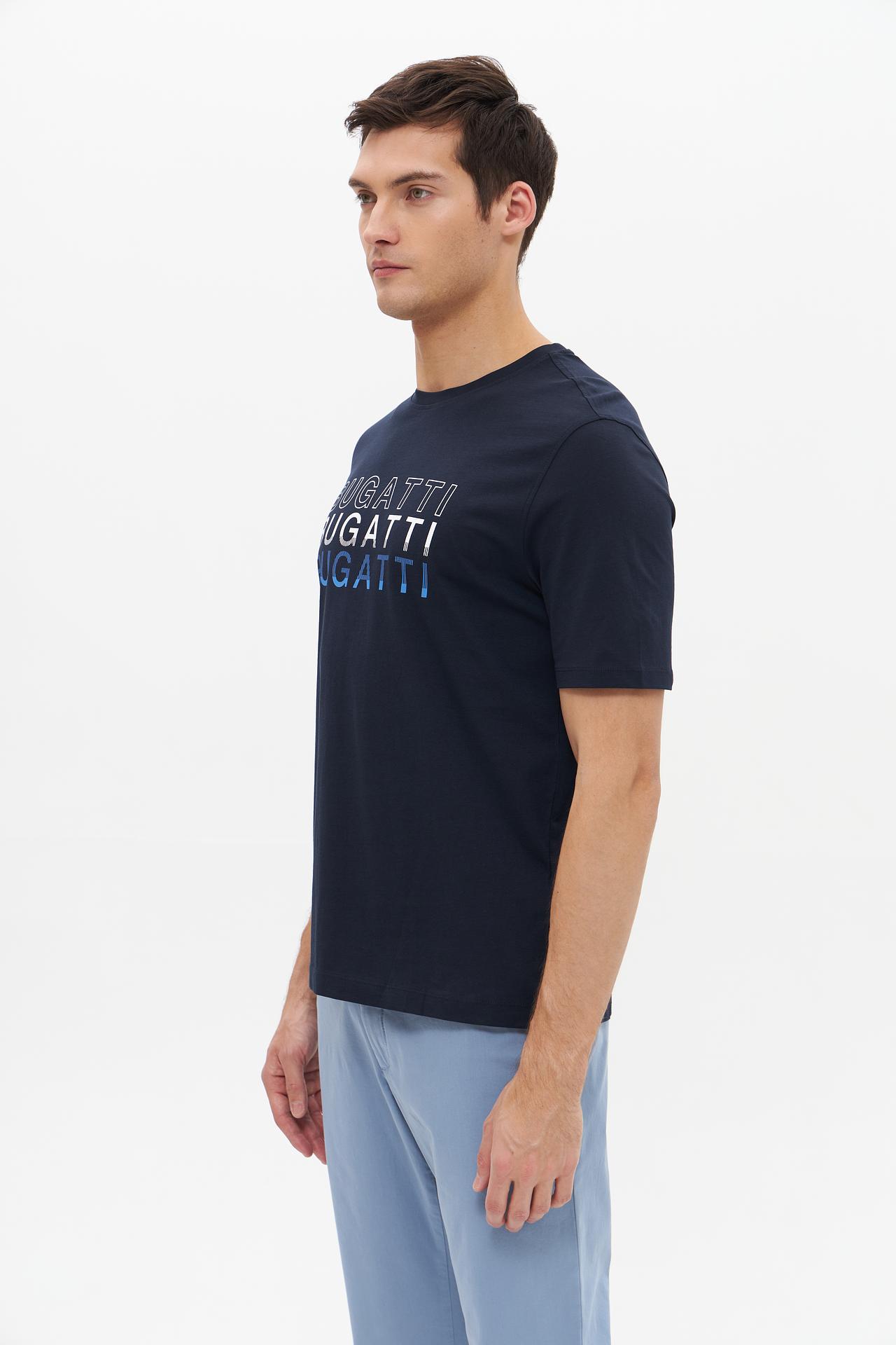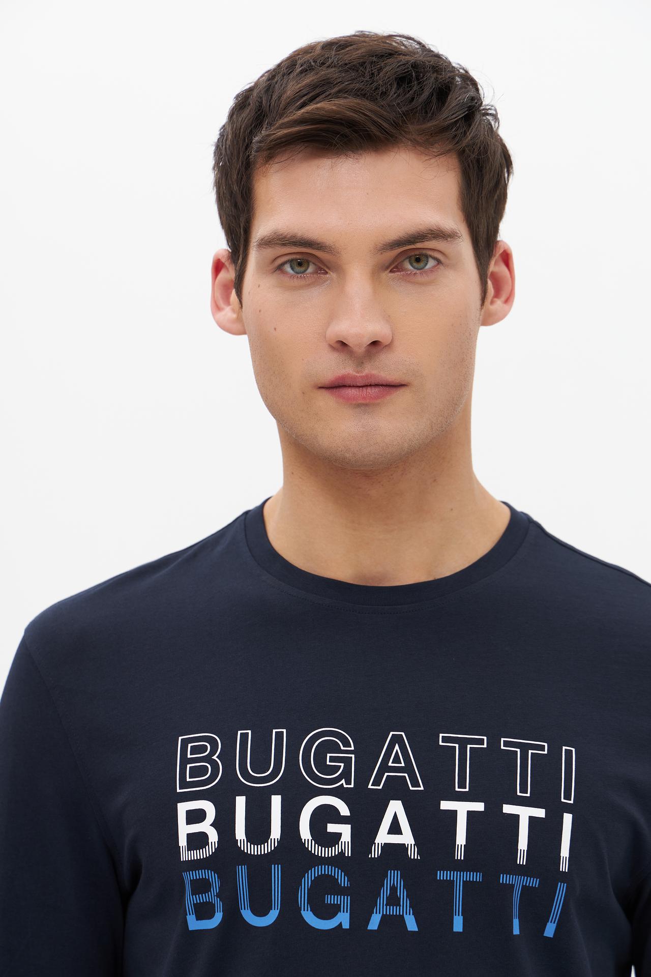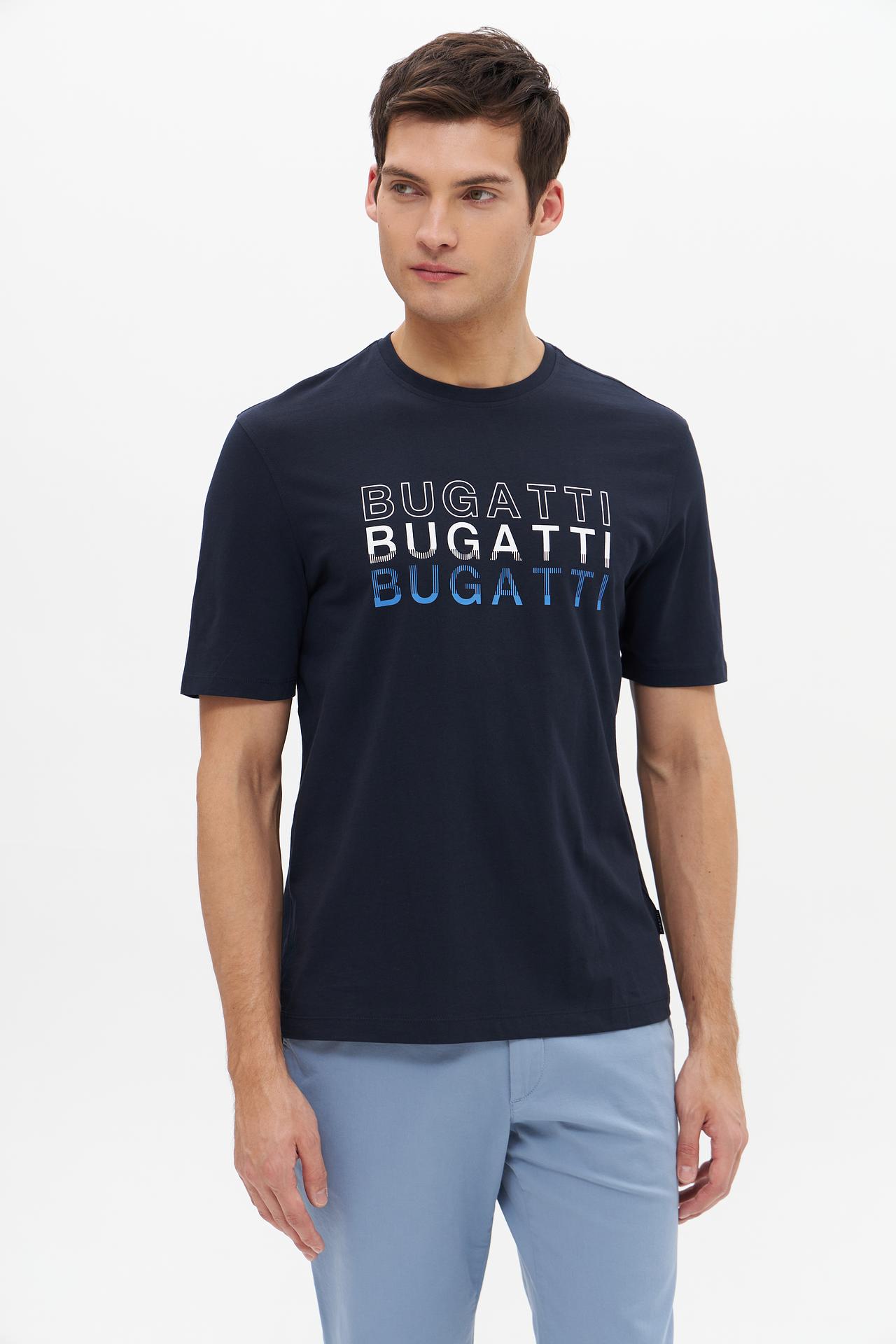 Центральный элемент дизайна – многослойный принт логотипа Bugatti в белых и синих оттенках, который придает изделию динамичный и узнаваемый вид. Футболка отлично впишется как в повседневные образы с джинсами или шортами, так и в более строгие комплекты с брюками чинос. Это стильная основа для создания актуальных мужских луков.