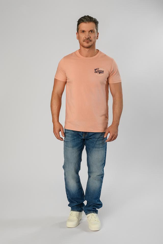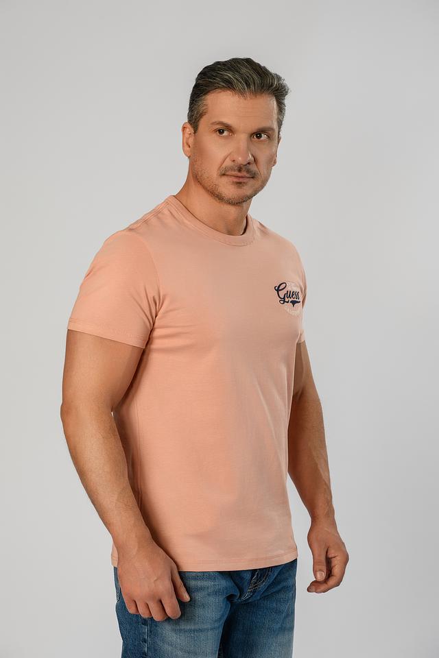 Мужская футболка Guess розового цвета с логотипом бренда на груди и эффектным принтом на спине. Изготовлена из 100% хлопка, обеспечивающего комфорт в носке. Состав: хлопок 100%