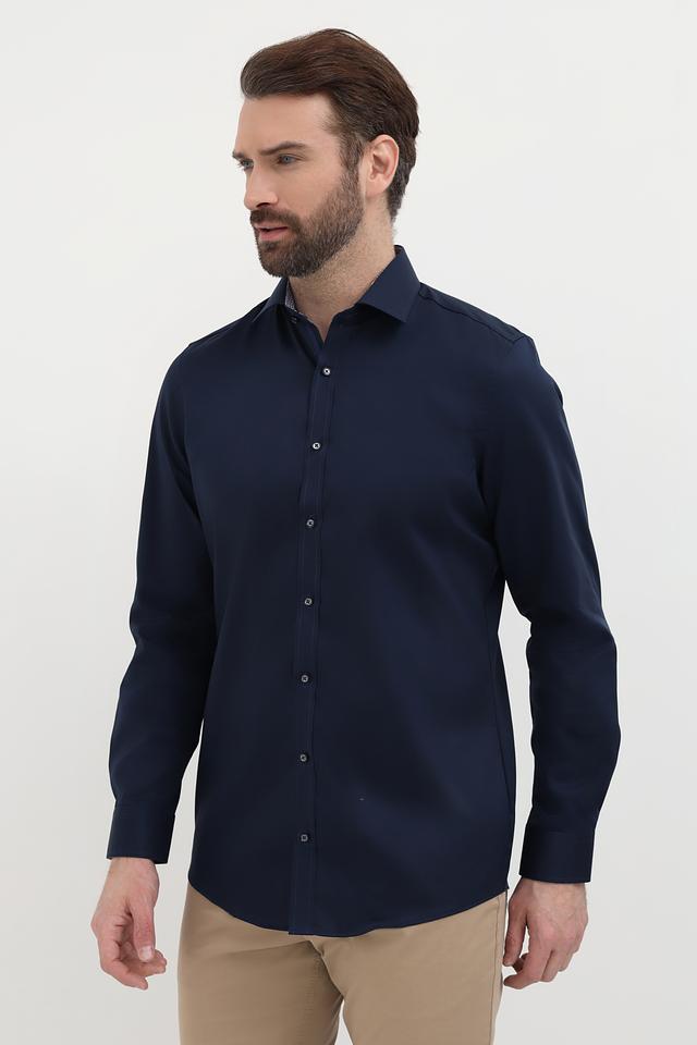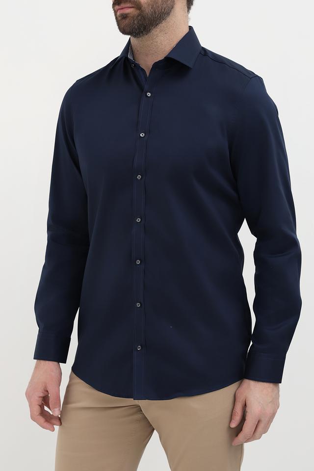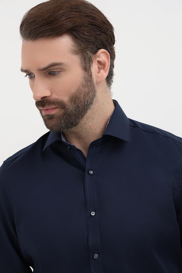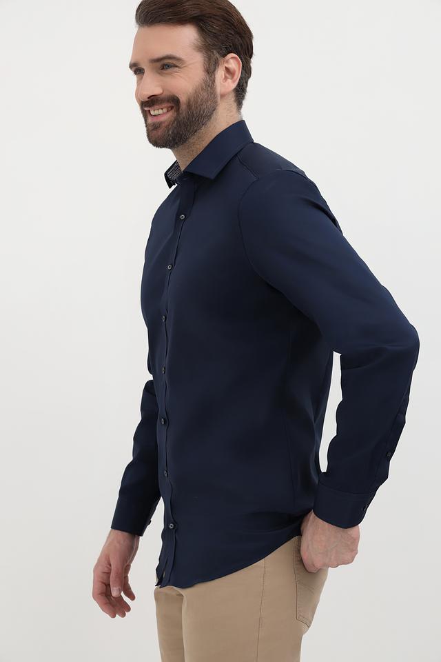 Рубашка имеет длинные рукава, стандартный воротник и застежку на пуговицы. Внутренняя сторона воротника и манжеты оформлены мелким принтом, добавляющим изысканности.