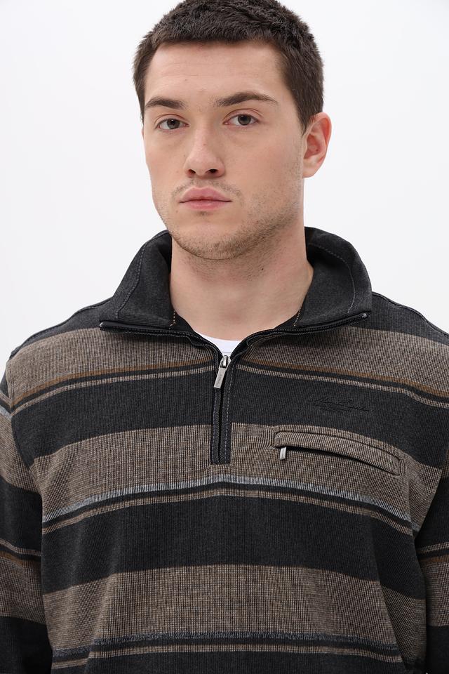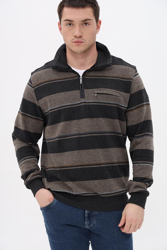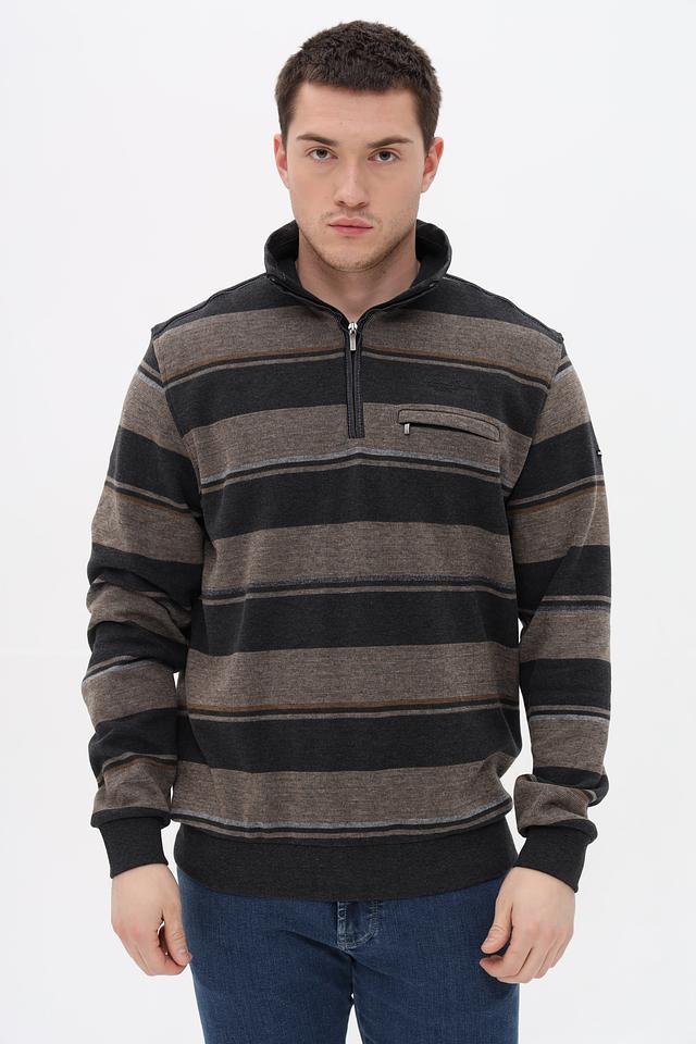 Мужской джемпер Monte Carlo серого цвета с полосатым узором и воротником-стойкой. Изготовлен из 100% хлопка, обеспечивающего комфорт и удобство в носке. Модель дополнена функционарной молнией и накладным карманом. Состав: хлопок 100%