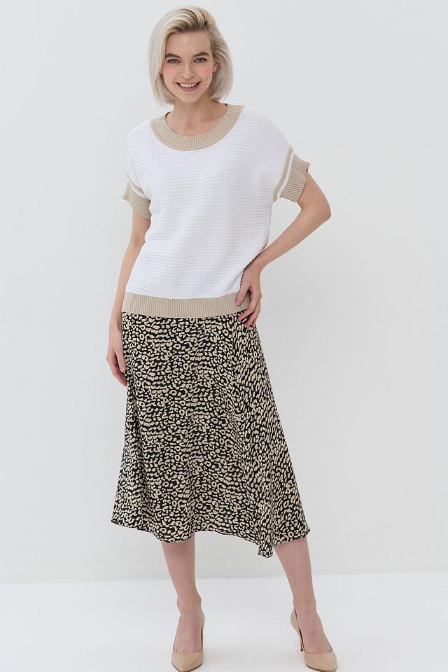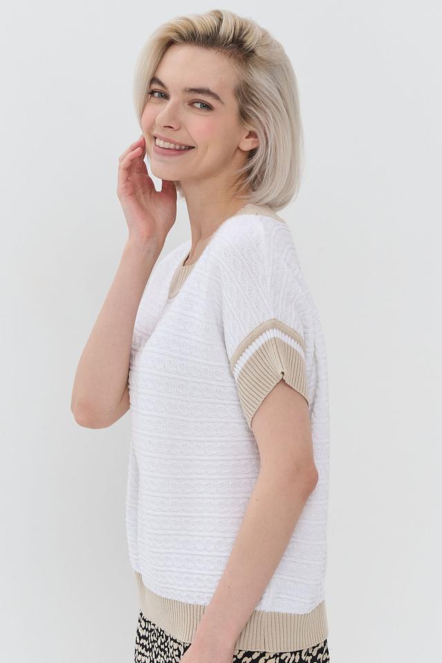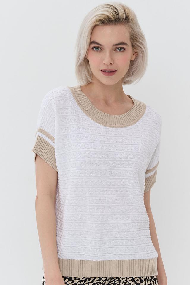 Белый джемпер NEWVAY с коротким рукавом и бежевой полоской на горловине и рукавах. Модель выполнена из мягкого и приятного к телу трикотажа, идеально подходит для создания повседневных образов. Состав: хлопок 50%, пан 50%