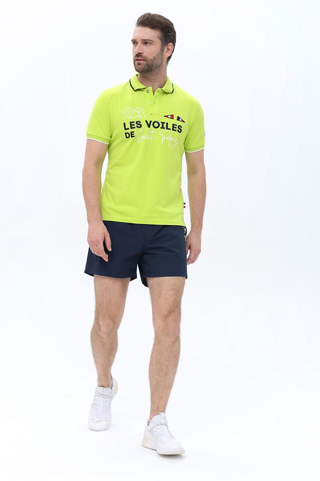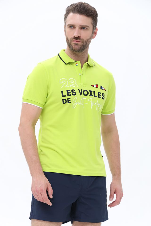 Модель имеет классический крой, короткие рукава и воротник-поло с трёхпуговичной застёжкой. На груди расположен оригинальный принт с надписью "23 LES VOILES DE Saint-Tropez" и изображением флагов.