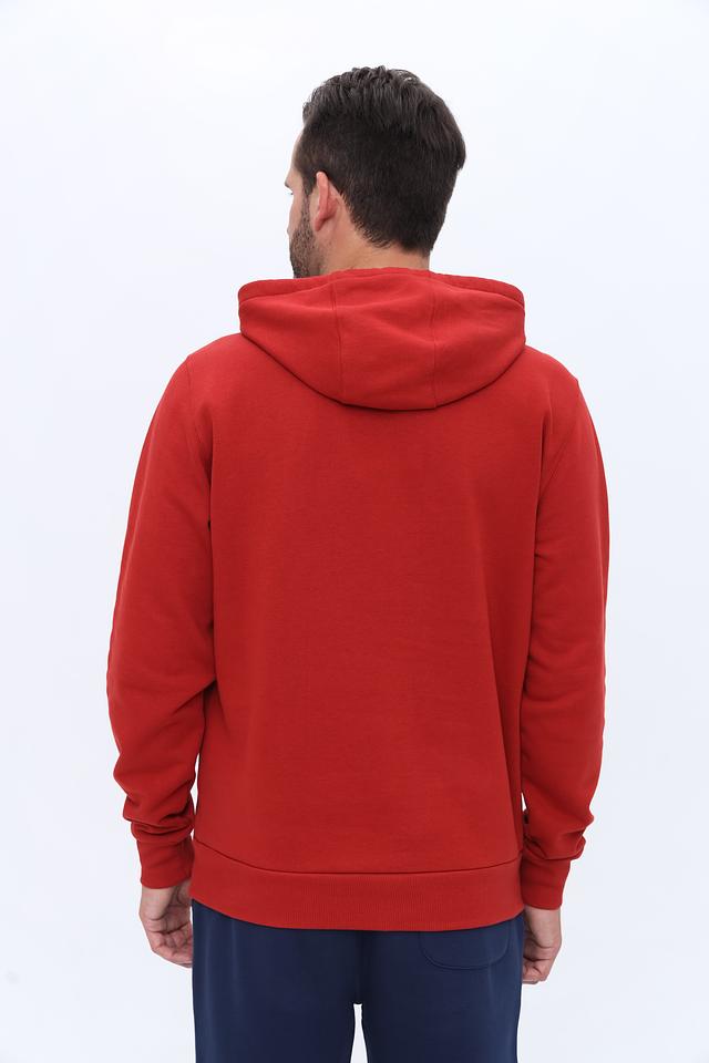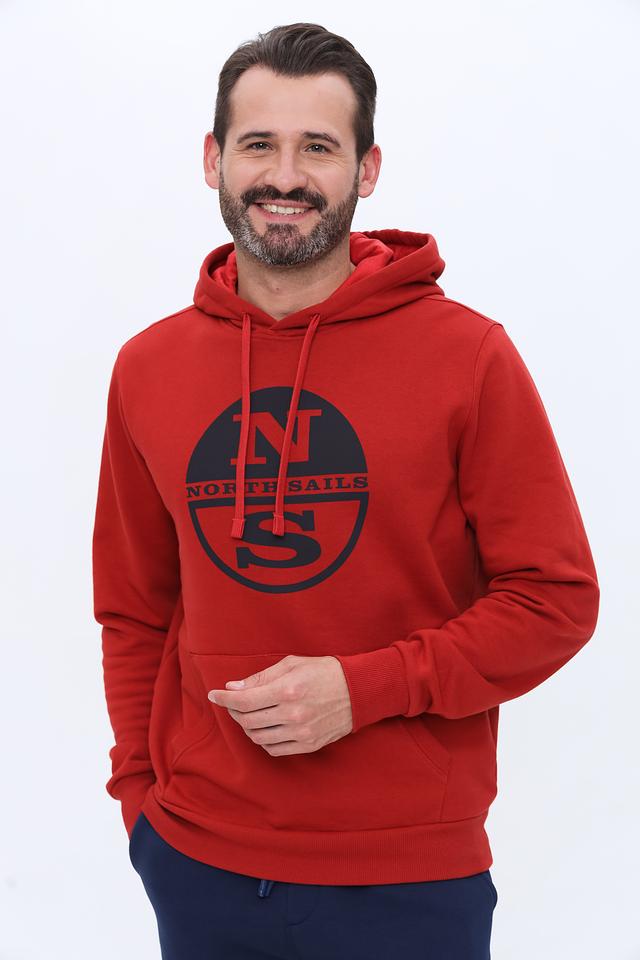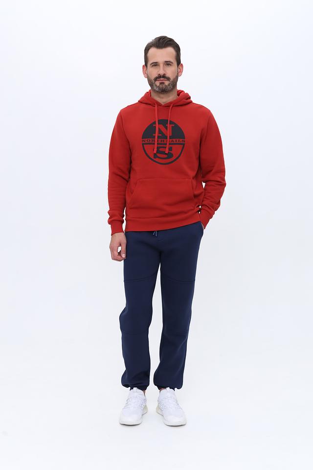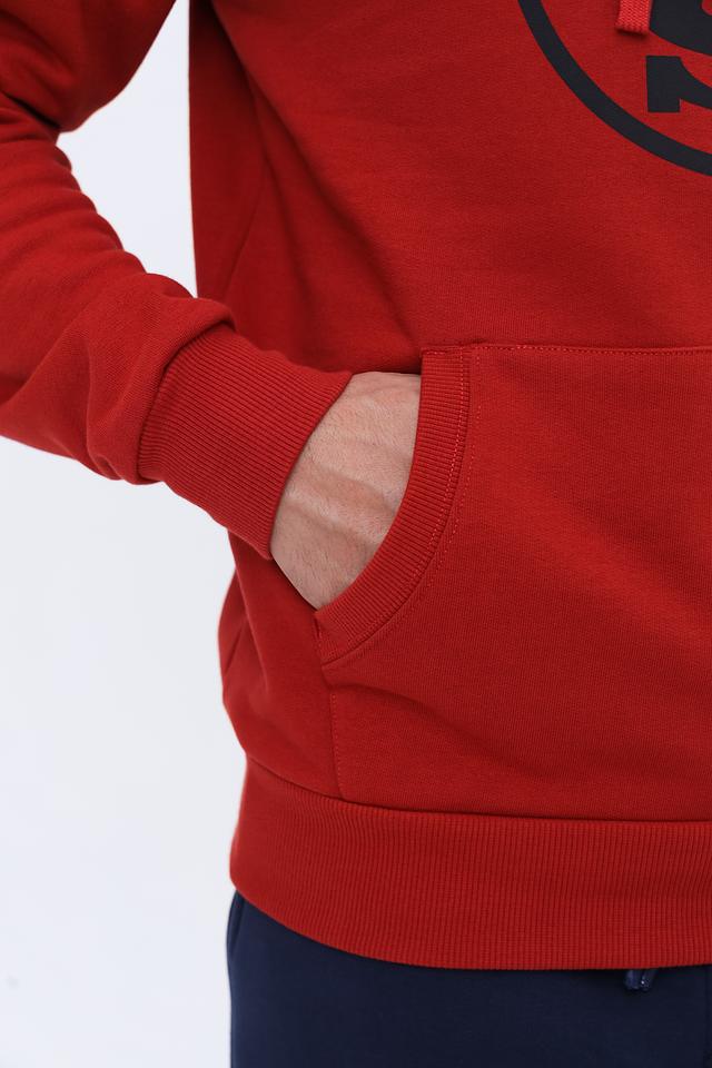 Мужская толстовка от North Sails выполнена в насыщенном красном цвете. Модель имеет классический крой с капюшоном и карманом-кенгуру. На груди расположена крупная графика с логотипом бренда, выполненная в чёрном цвете.