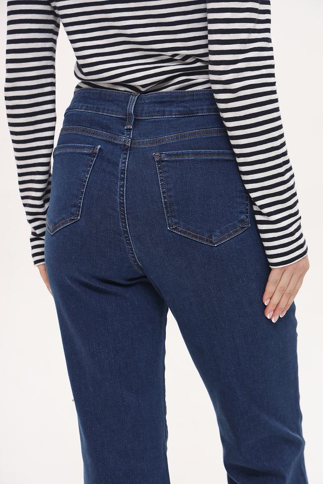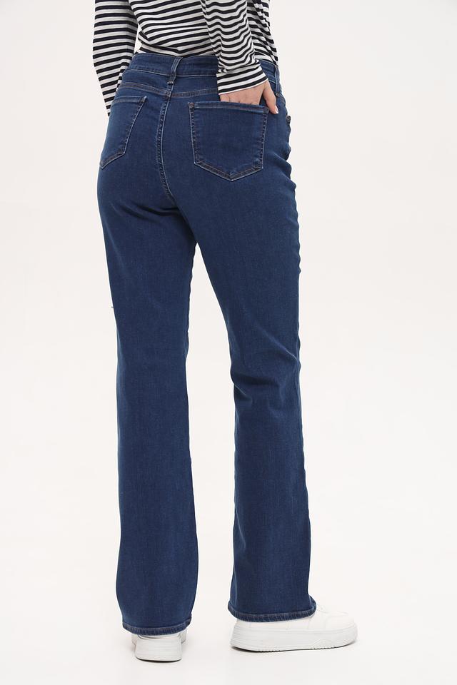 Джинсы имеют крой клеш, который визуально удлиняет ноги и создает элегантный силуэт. Высокая посадка подчеркивает талию и обеспечивает комфортную посадку в течение всего дня. Пять карманов – два спереди и два сзади – добавляют функциональности и практичности.