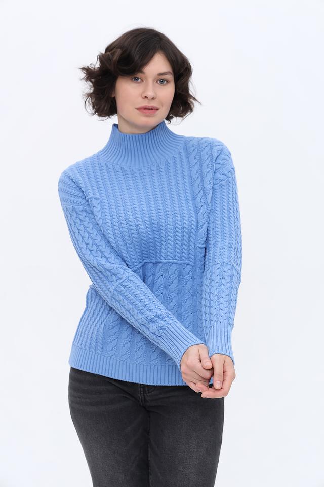 Модель имеет высокий воротник и длинные рукава, а также украшена рельефным узором из кос, придающим ей особый шарм. Пуловер имеет слегка свободный крой, обеспечивающий комфорт в носке.