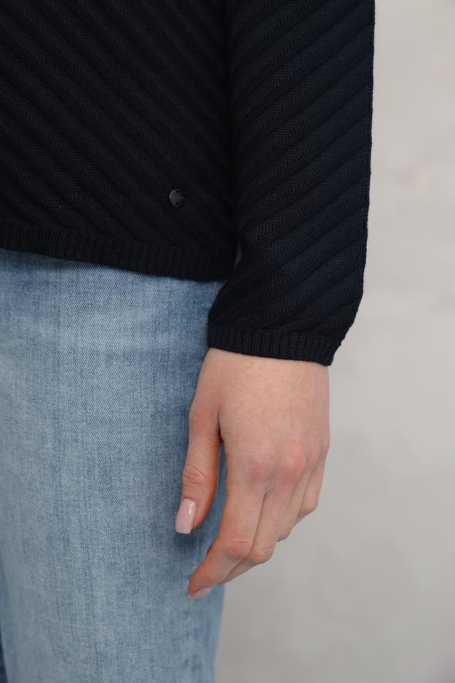 Особенностью модели является выразительная текстура, создающая визуальный интерес и добавляющая объём. Пуловер имеет круглый вырез горловины и длинные рукава, обеспечивающие тепло и уют.