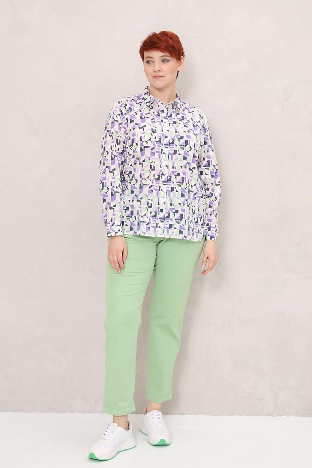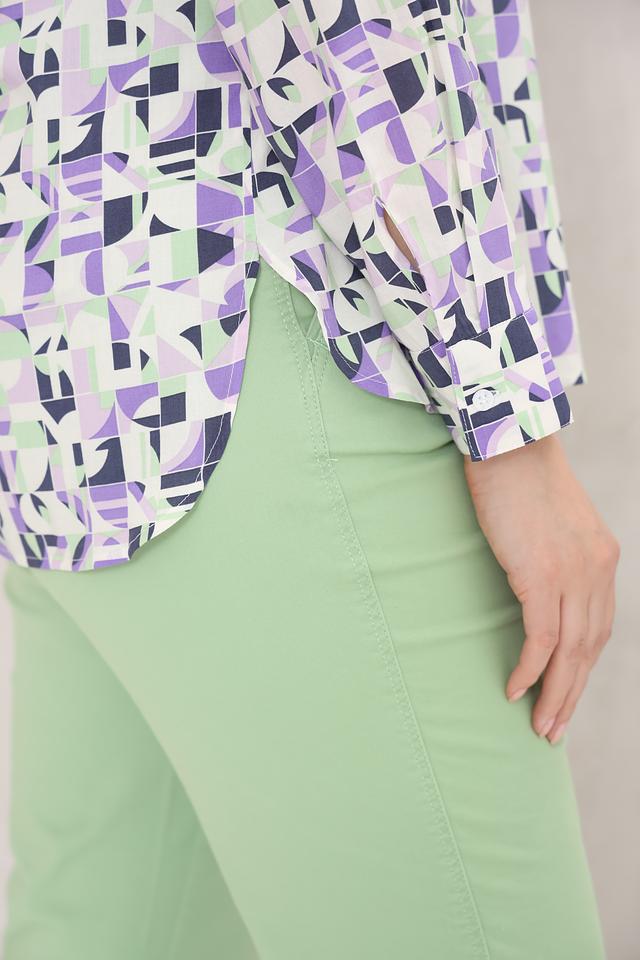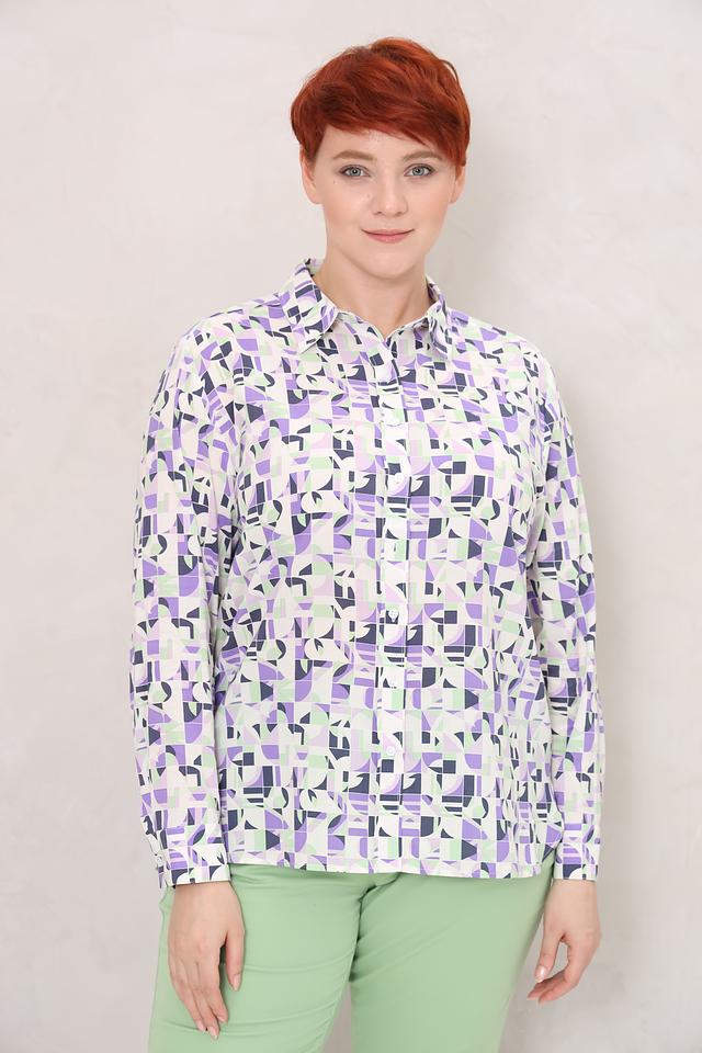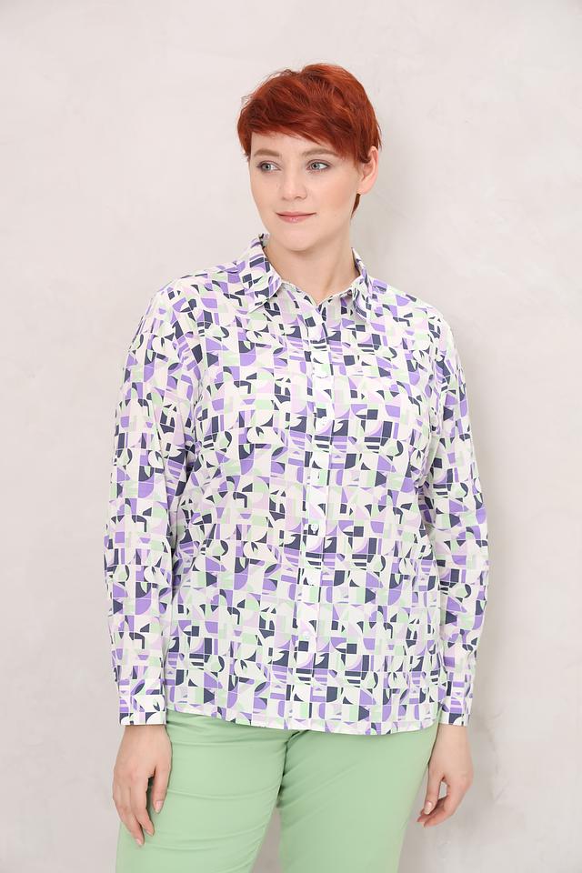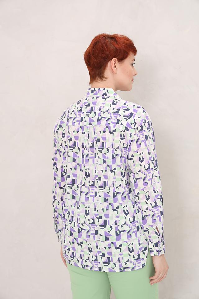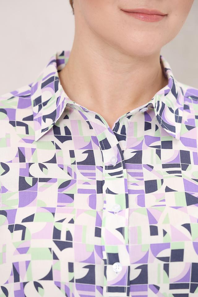 Блуза имеет классический крой с длинными рукавами и отложным воротником. Ее особенностью является оригинальный геометрический принт, выполненный в светло-фиолетовых, лавандовых и белых тонах. Принт придает блузе современный и стильный вид.