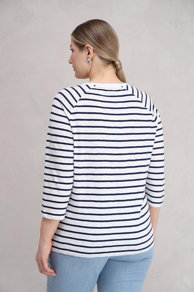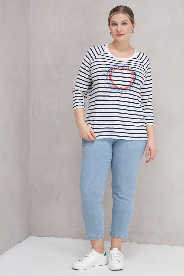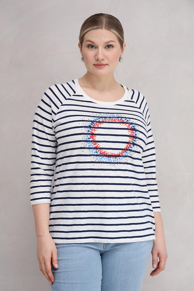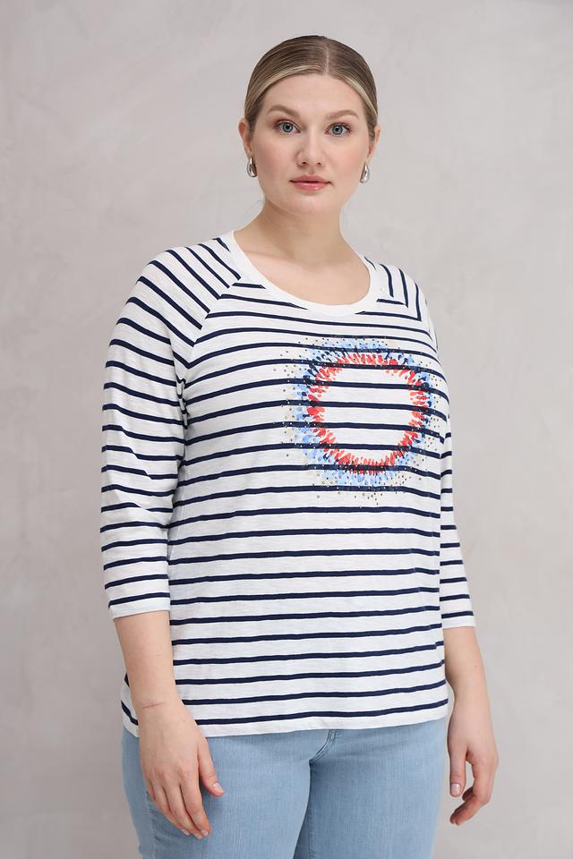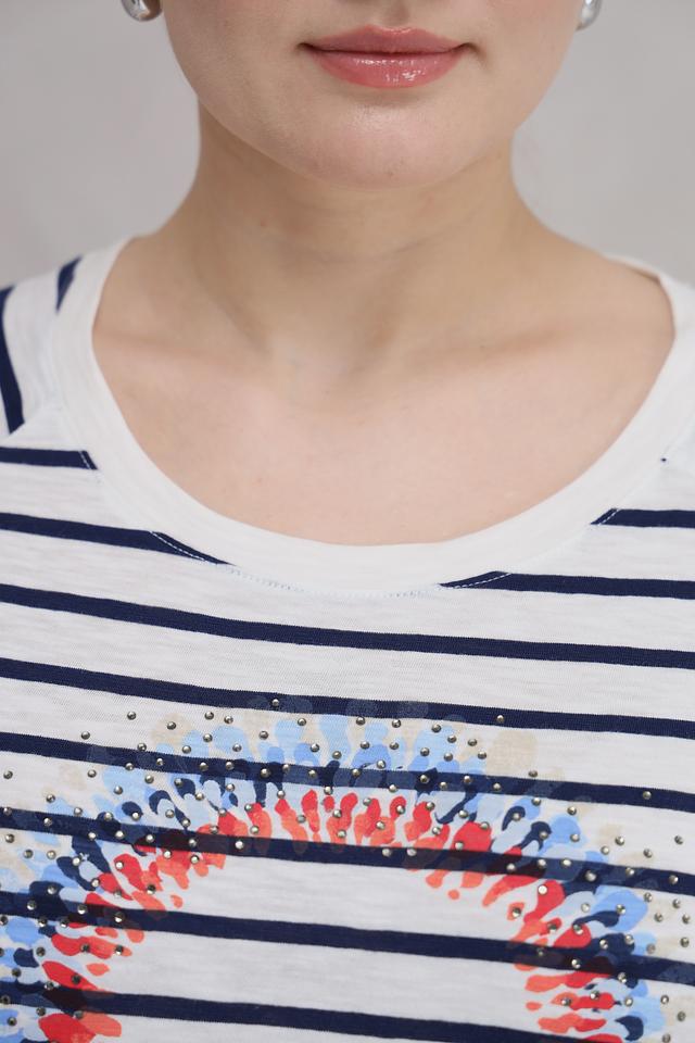 Блуза Olsen белого и синего цвета с яркой аппликацией в виде губ станет стильным дополнением к вашему гардеробу. Модель выполнена из мягкого хлопка, обеспечивающего комфорт в носке, и имеет удобный 3/4 рукав. Состав: хлопок 100%