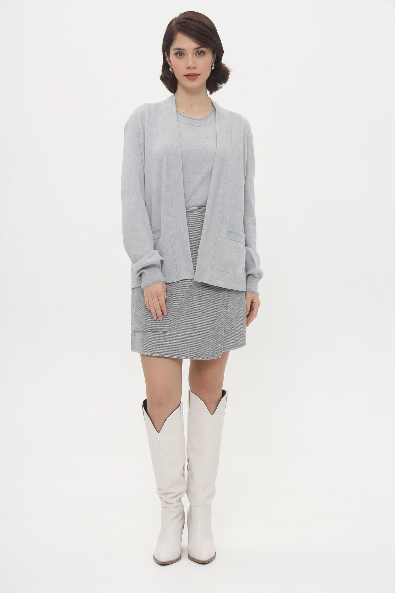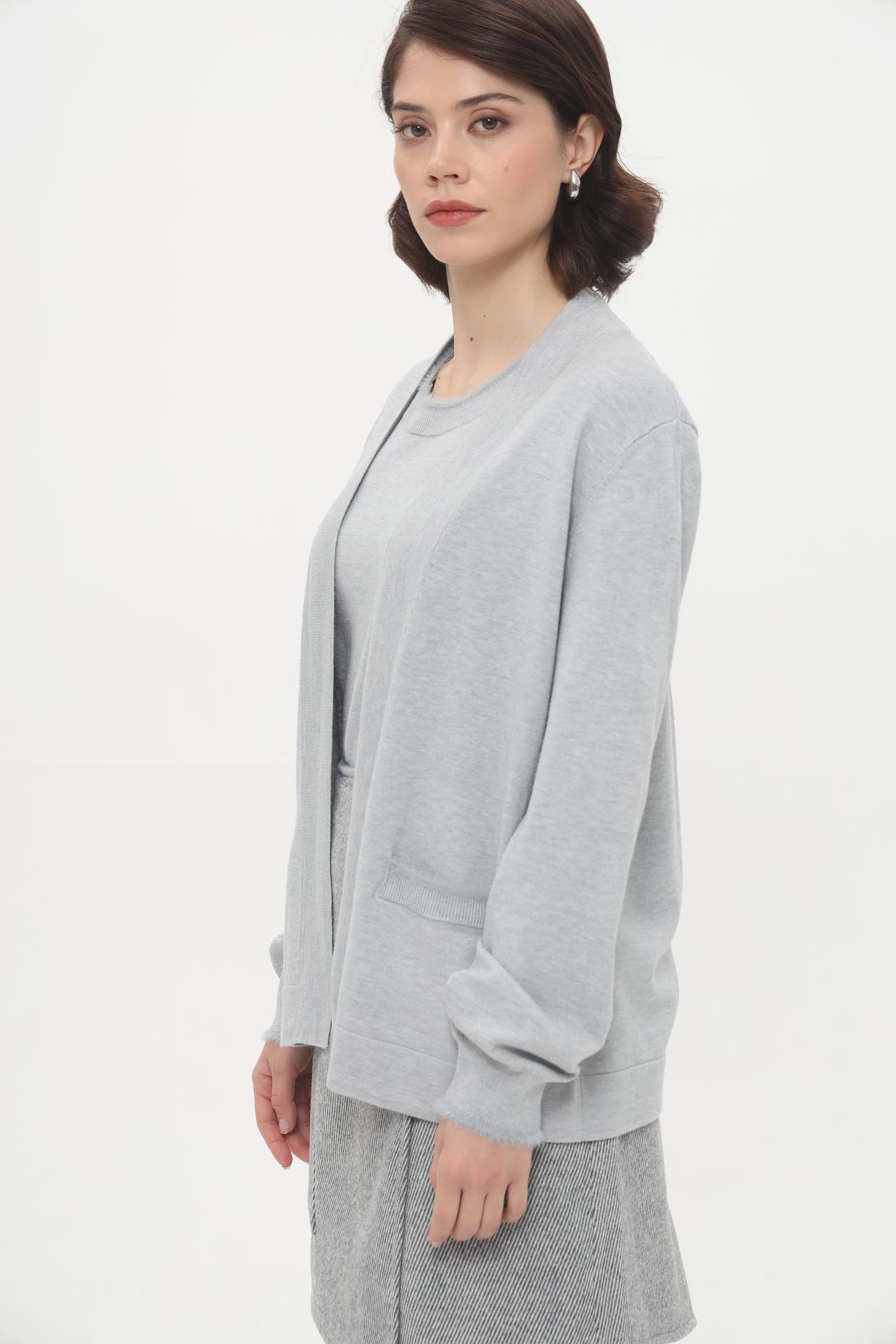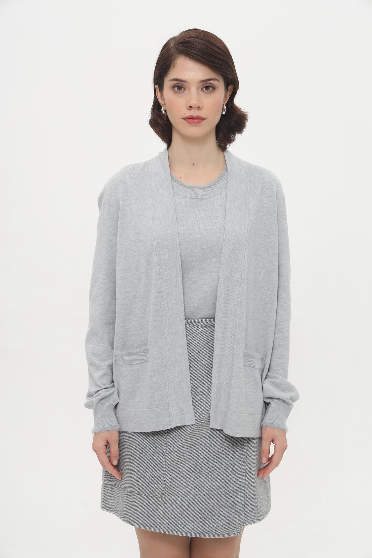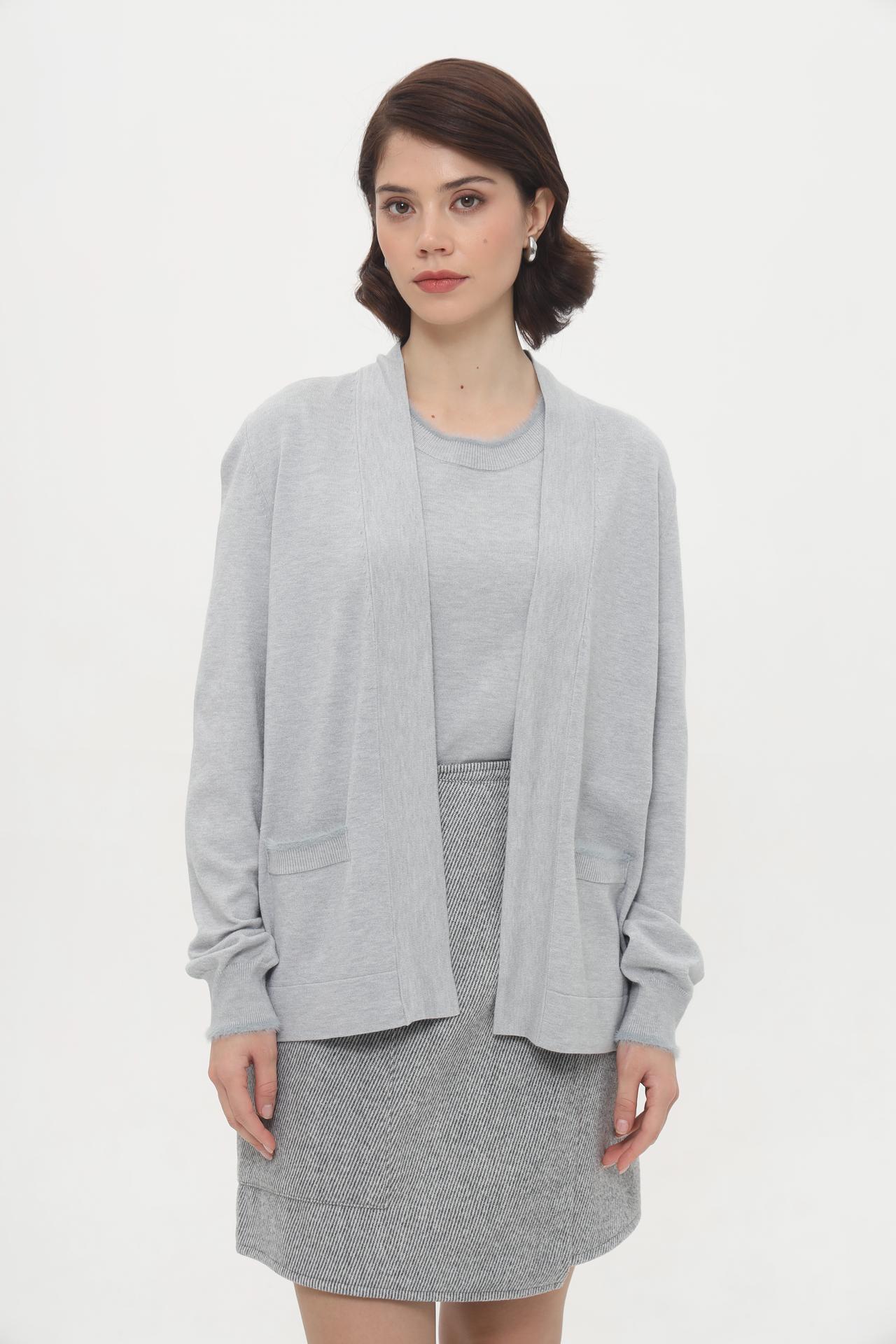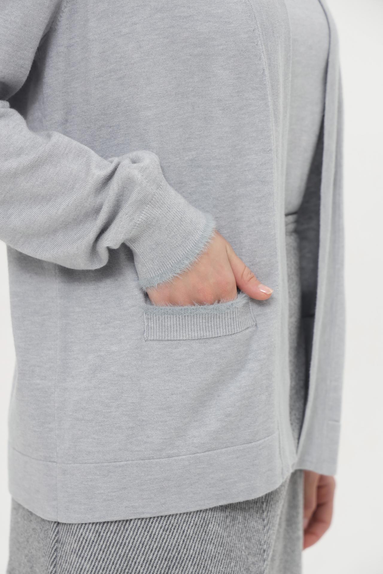 - Дизайн: Классический крой без застежки с V-образным вырезом и удобными накладными карманами. Манжеты и нижний край отделаны бахромой, добавляющей изюминку.