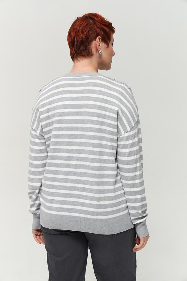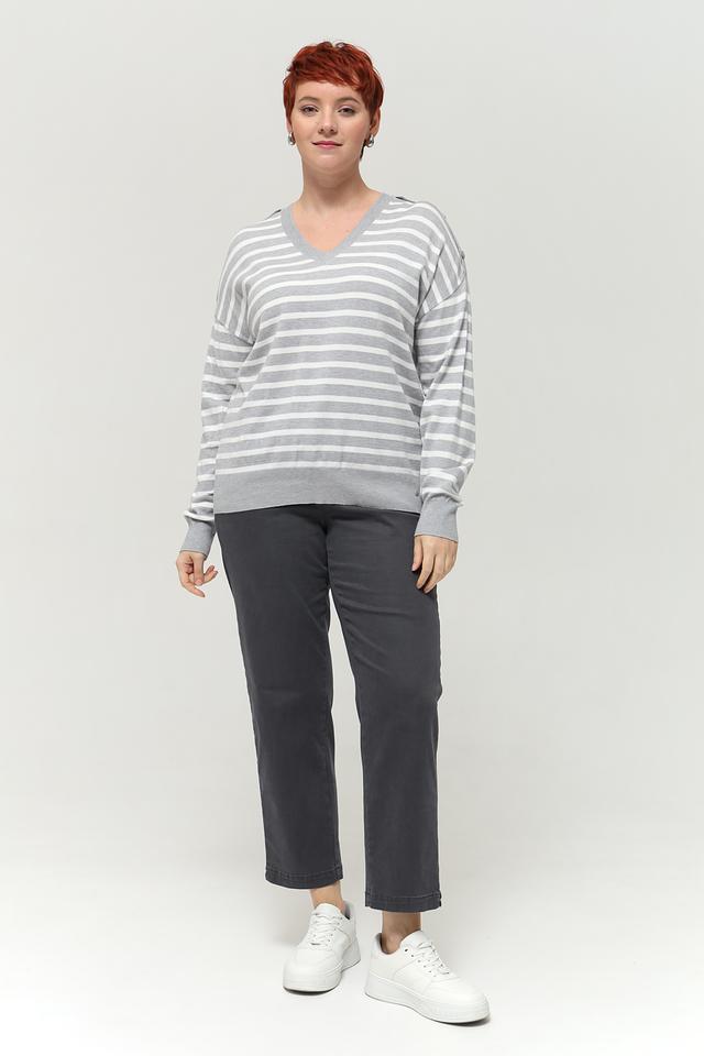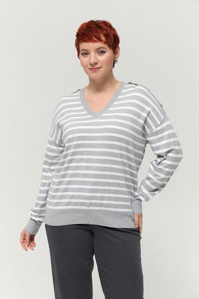 Этот пуловер от Olsen выполнен в классическом стиле с полосатым узором. Преобладающий цвет – серый, что делает его универсальным элементом гардероба, легко сочетаемым с различными вещами.