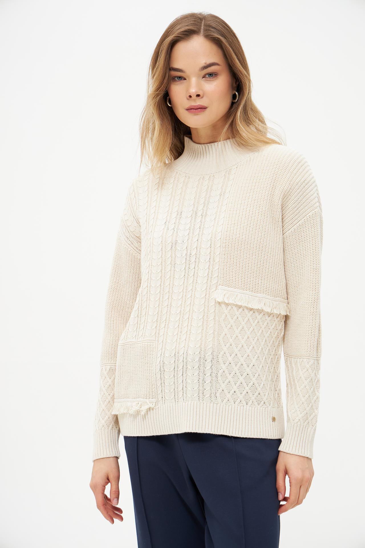 - Уникальный дизайн: Пуловер украшен разнообразными вязаными узорами, включая объемные косы и ромбы, а также акцентами с короткой бахромой. Высокий воротник-стойка придает изделию дополнительную изысканность и тепло.