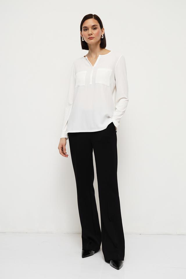 Блузка имеет прямой крой, длинные рукава и V-образный вырез горловины. На груди расположены два накладных кармана, которые добавляют образу функциональности и стиля.