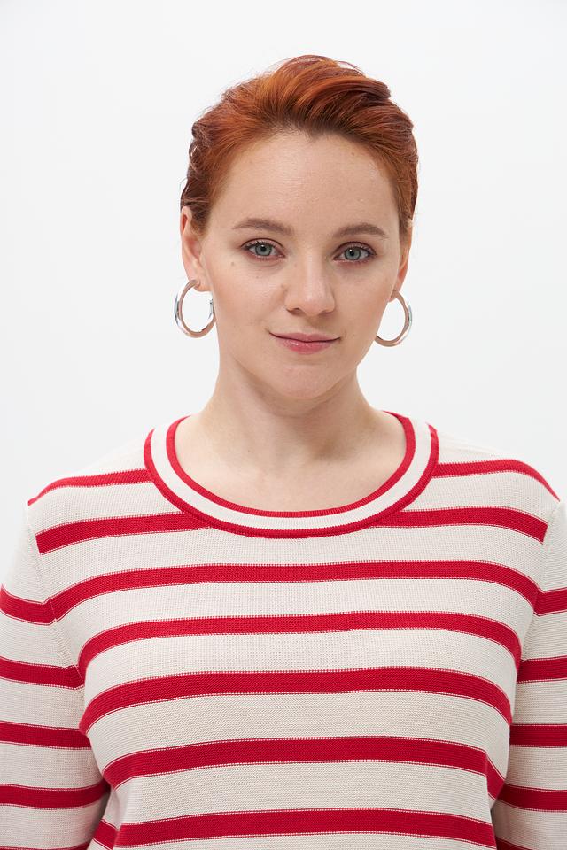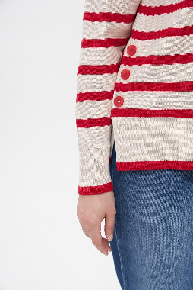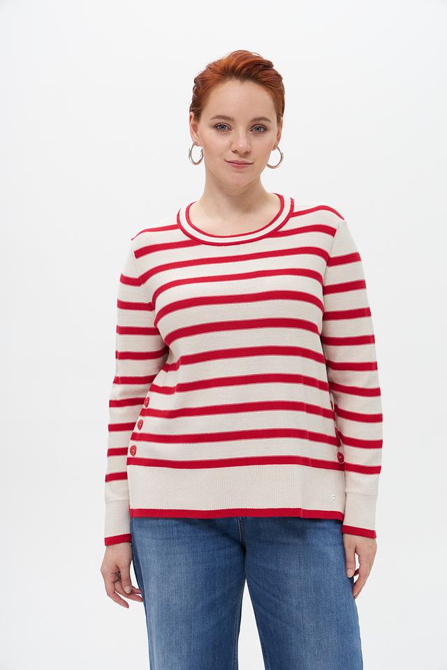 Женский пуловер от бренда Olsen выполнен в классическом стиле с полосатым узором. Преобладающий цвет – бежевый, полосы – красные. Модель имеет круглый вырез горловины и длинные рукава.