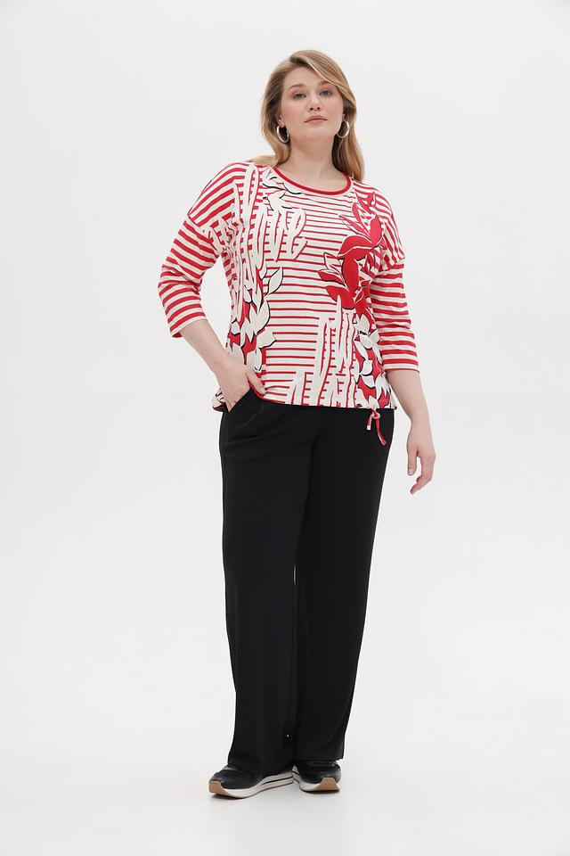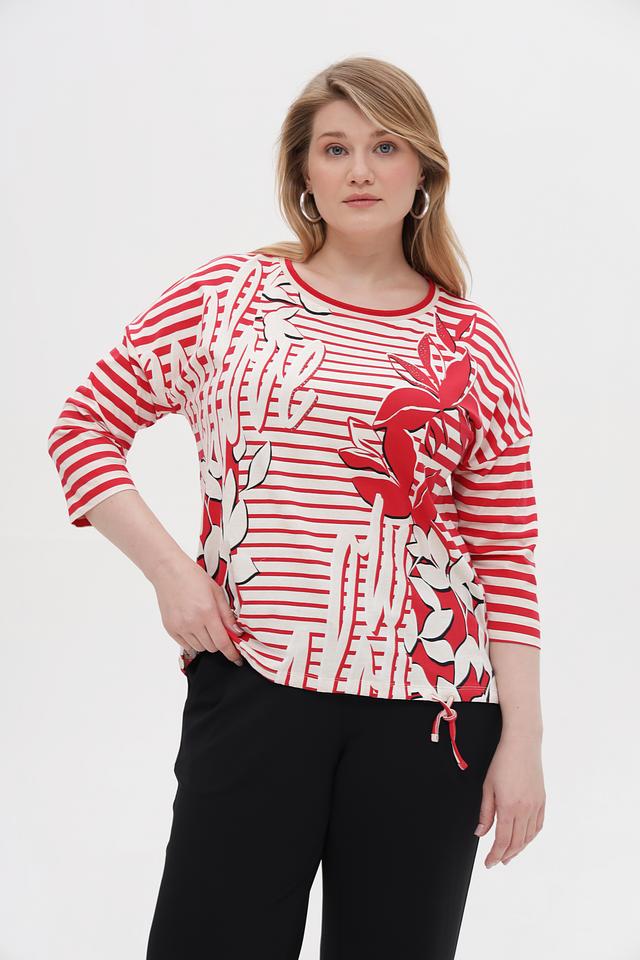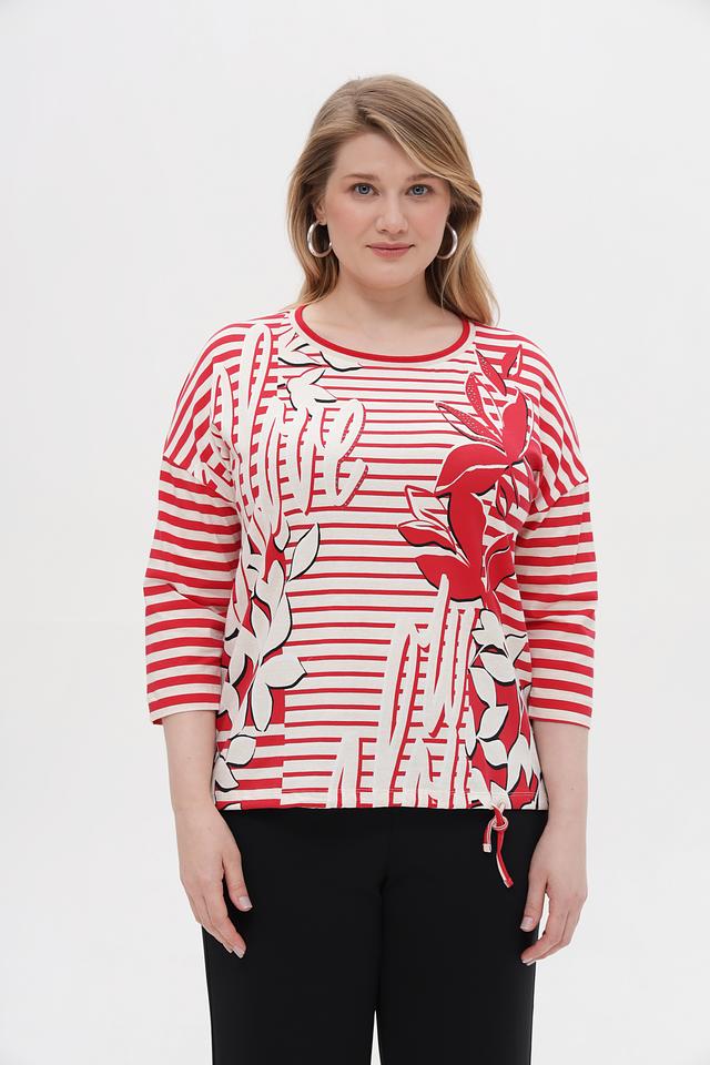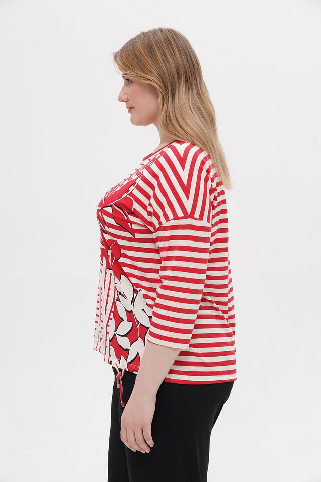 Блуза имеет яркий цветочный принт на фоне красных и белых полосок. Округлый вырез горловины и рукава 3/4 делают ее универсальной для различных образов. Сбоку блузы предусмотрена небольшая кулиска с завязками, которая позволяет регулировать силуэт.