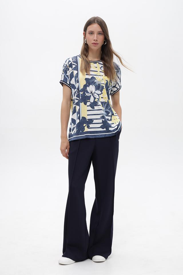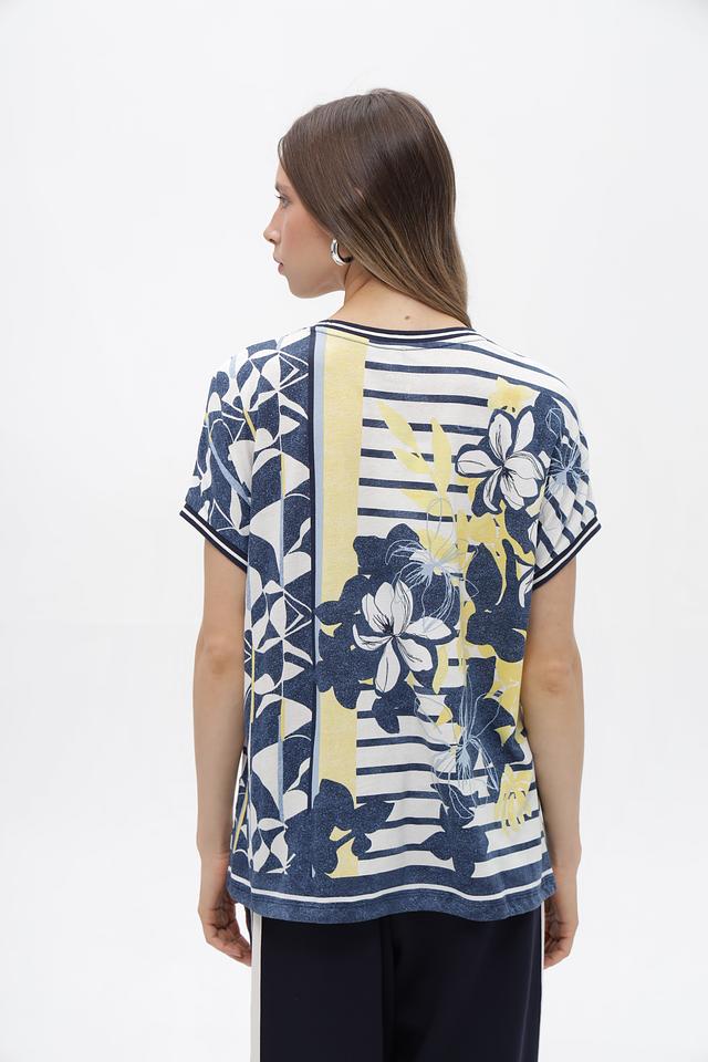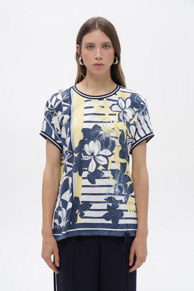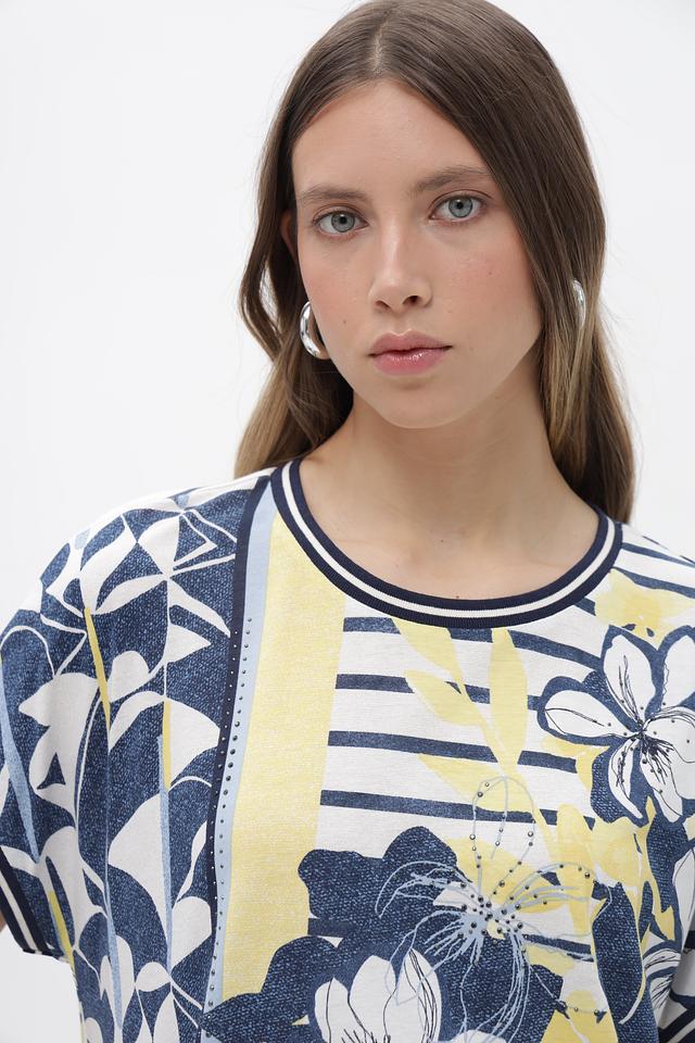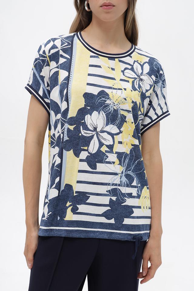 Женская футболка от бренда Olsen – это стильное и комфортное решение для создания повседневных образов. Модель выполнена в сочетании синего, белого и жёлтого цветов и украшена крупным цветочным принтом, придающим ей особый шарм.
