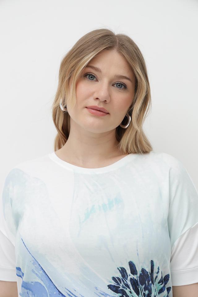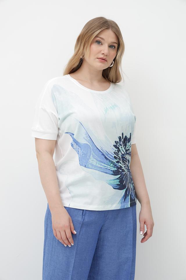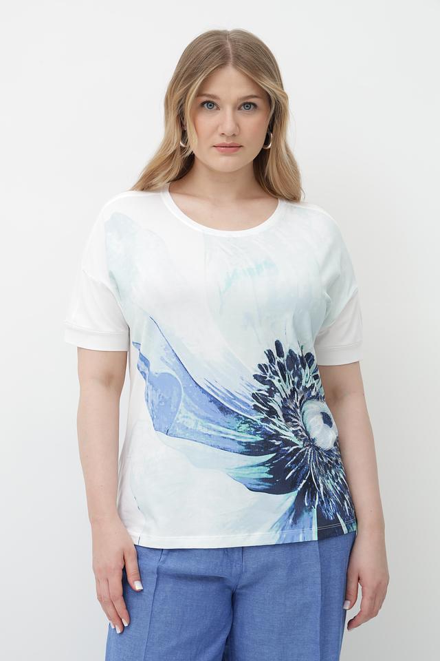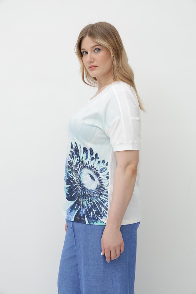 Женская футболка от бренда Olsen – это стильное и комфортное решение для создания повседневного образа. Футболка выполнена в белом цвете и украшена эффектным цветочным принтом в оттенках голубого.