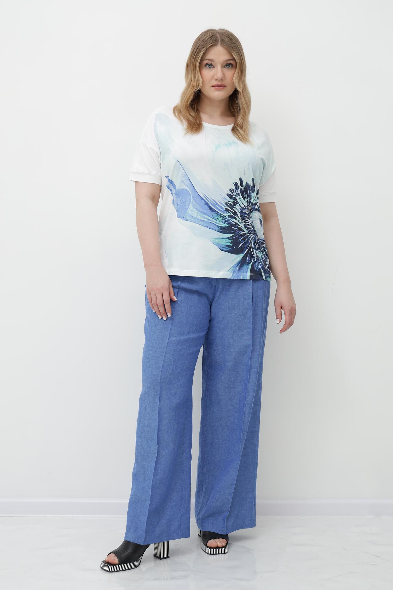 - Яркий принт: Объемный флористический принт в сине-бирюзовых тонах становится центральным акцентом изделия. Этот декор придает футболке уникальный и запоминающийся вид, подчеркивая индивидуальность.