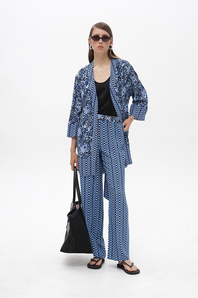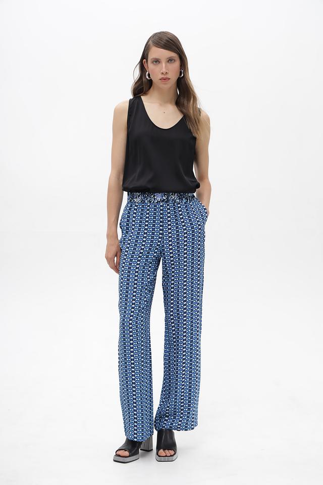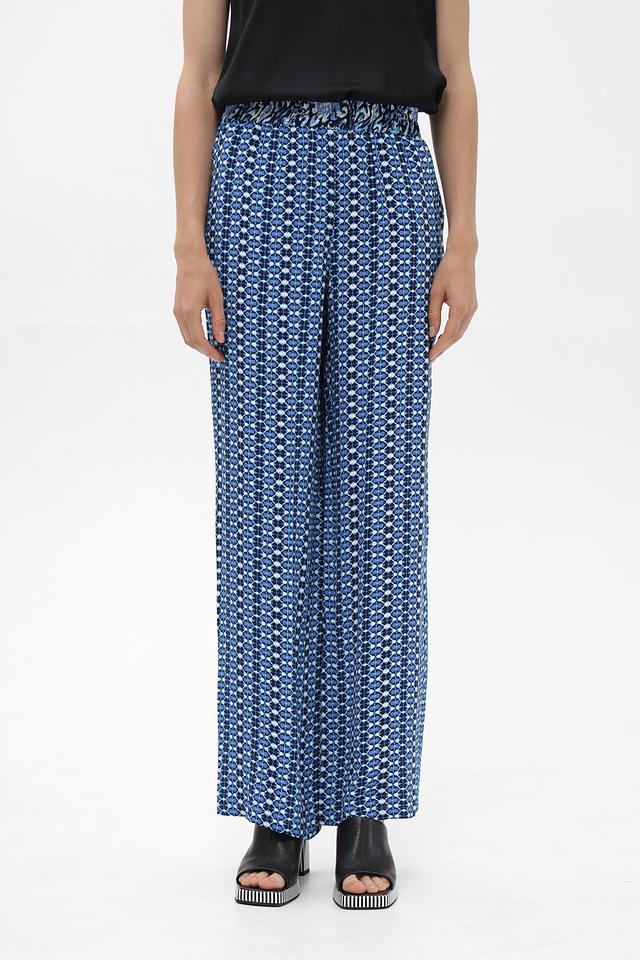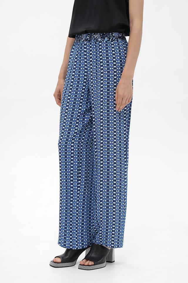 Представляем стильные брюки от бренда Olsen, выполненные в приятной синей цветовой гамме с ярким геометрическим принтом. Модель отличается свободным кроем и широкими штанинами, что обеспечивает максимальный комфорт и свободу движений.