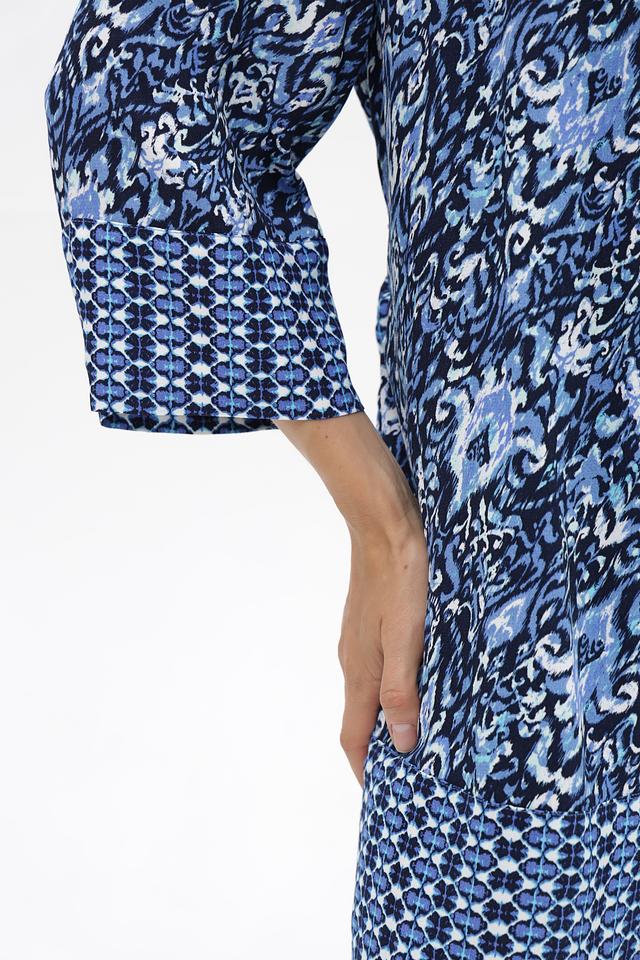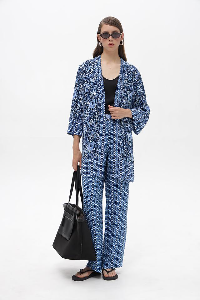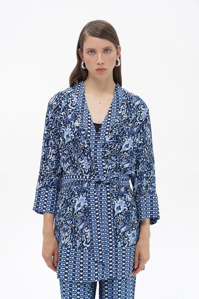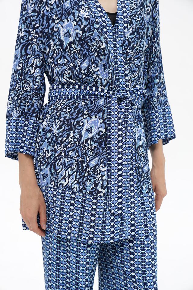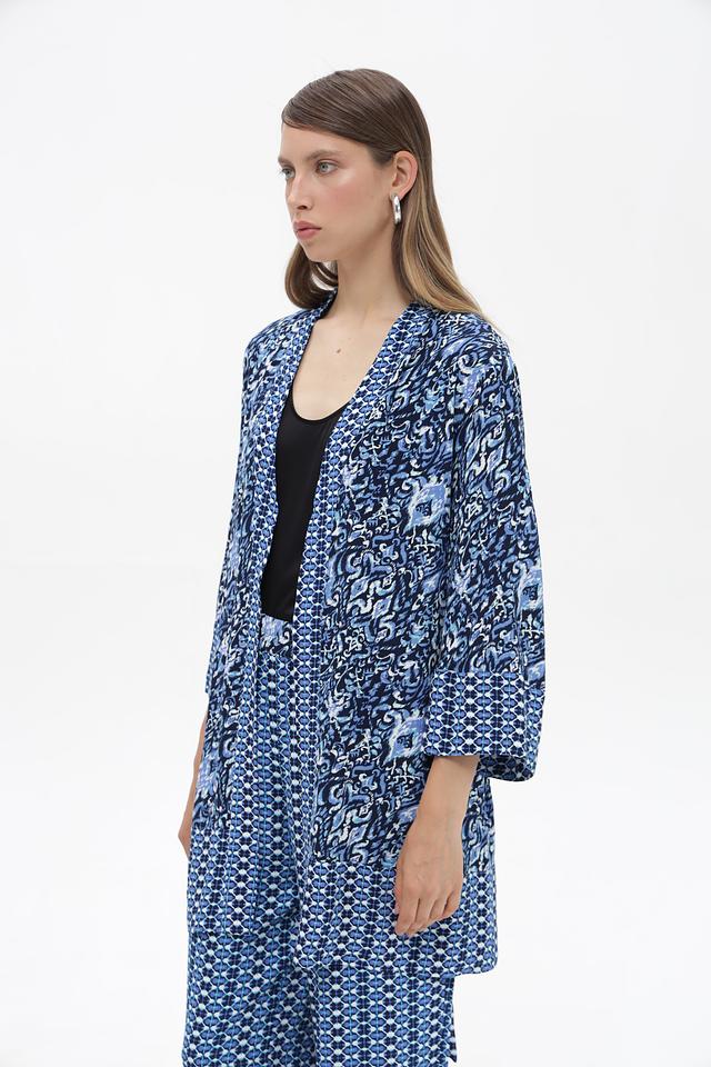 Синий жакет Olsen с оригинальным принтом и поясом. Изготовлен из мягкой вискозы, обеспечивающей комфорт в носке. Идеально дополнит ваш повседневный или вечерний образ. Состав: вискоза 100%