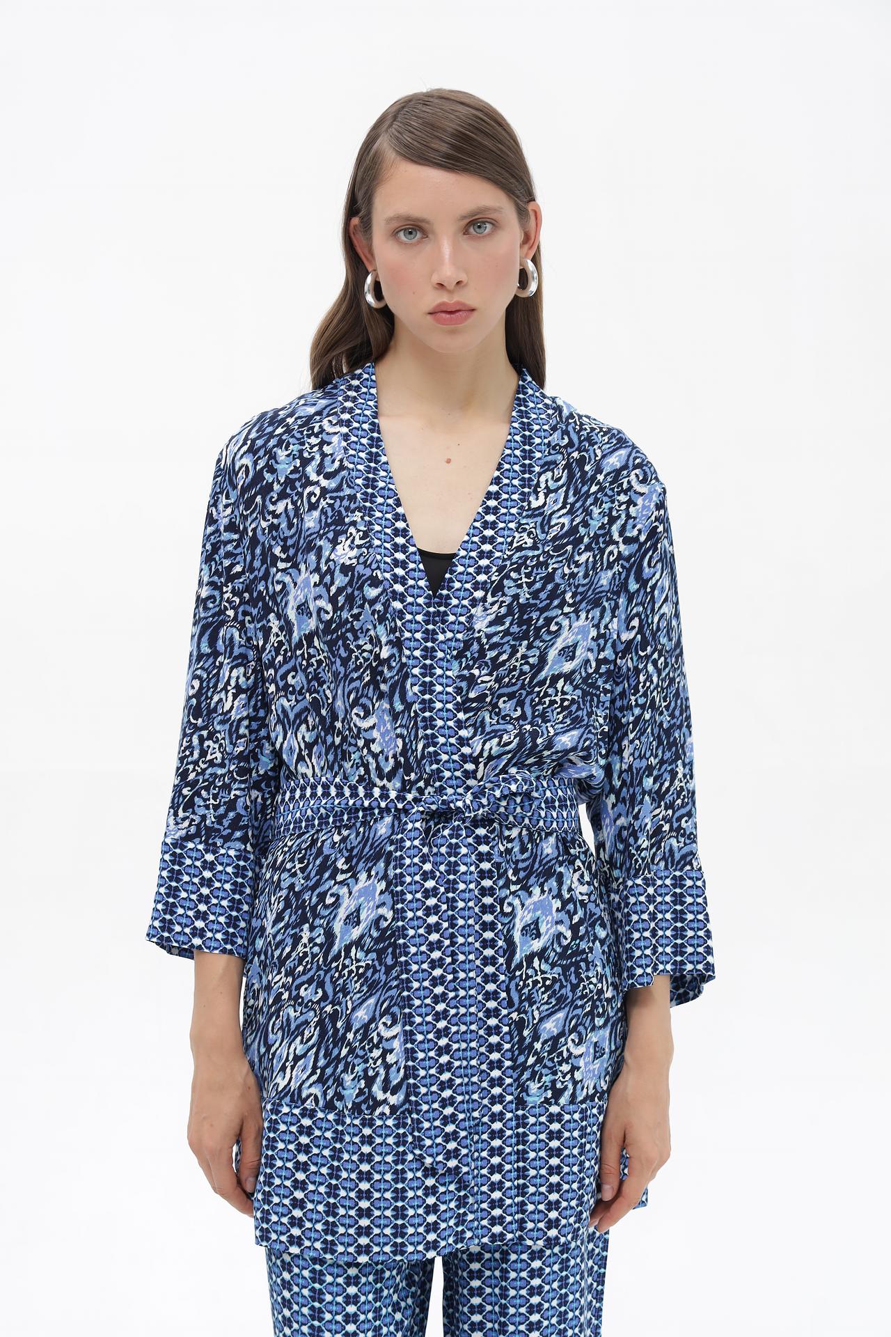 - Стильный узор. Принт в синих оттенках с геометрическими и абстрактными элементами добавляет динамичности и индивидуальности образу. Модный дизайн делает жакет акцентной вещью.