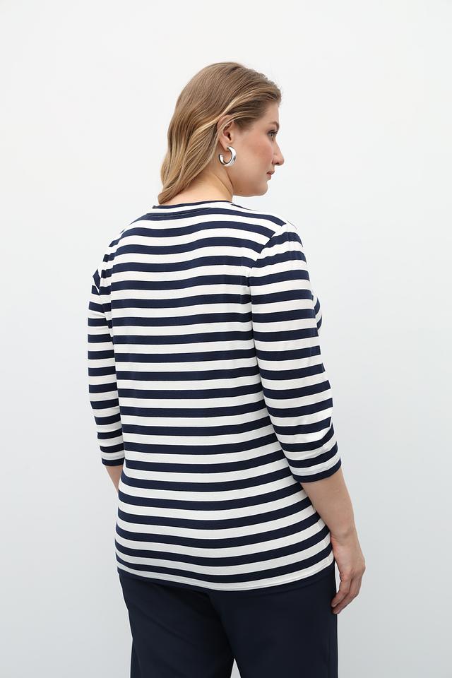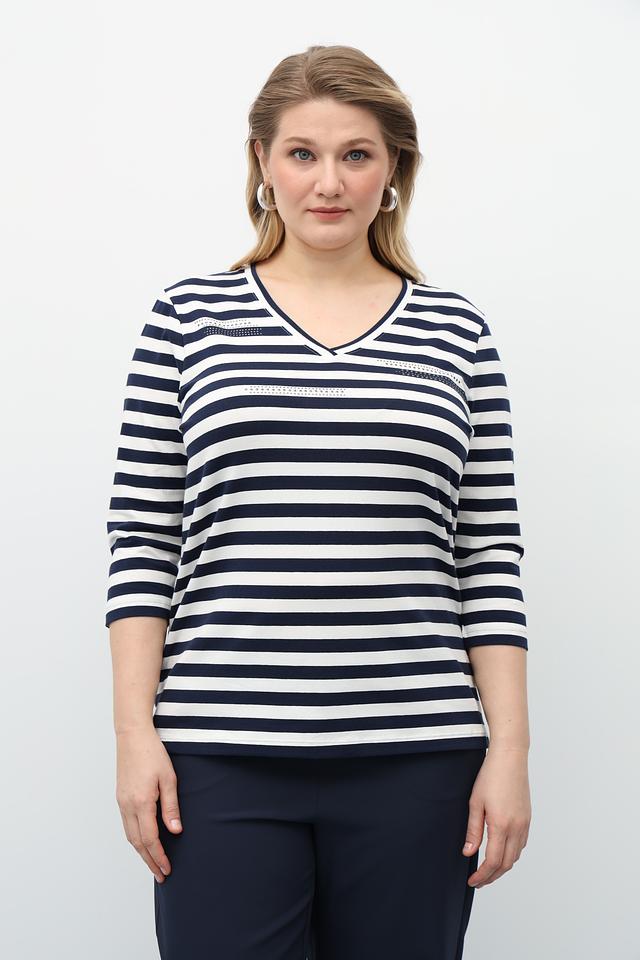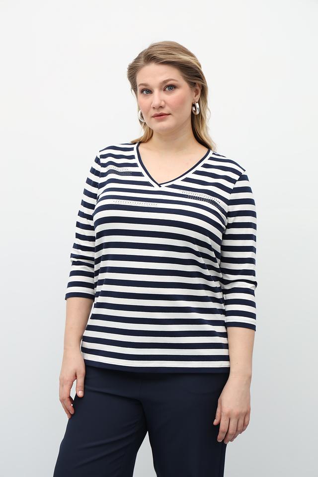Футболка имеет классический V-образный вырез горловины и рукав длиной 3/4. Дизайн изделия выполнен в виде горизонтальных полос синего и белого цветов. Дополнительным акцентом служат декоративные элементы в области плеч и груди, выполненные в виде мелких страз.